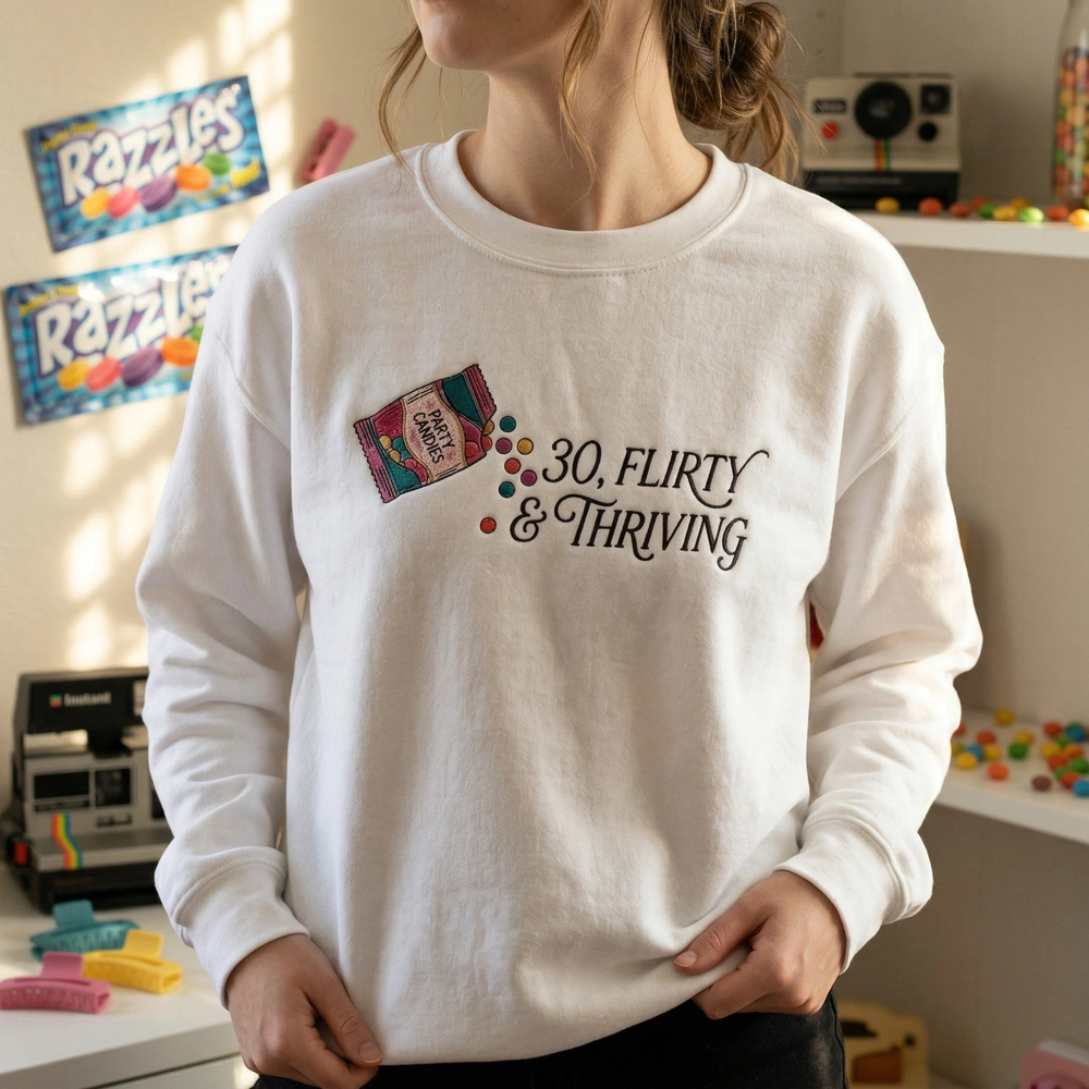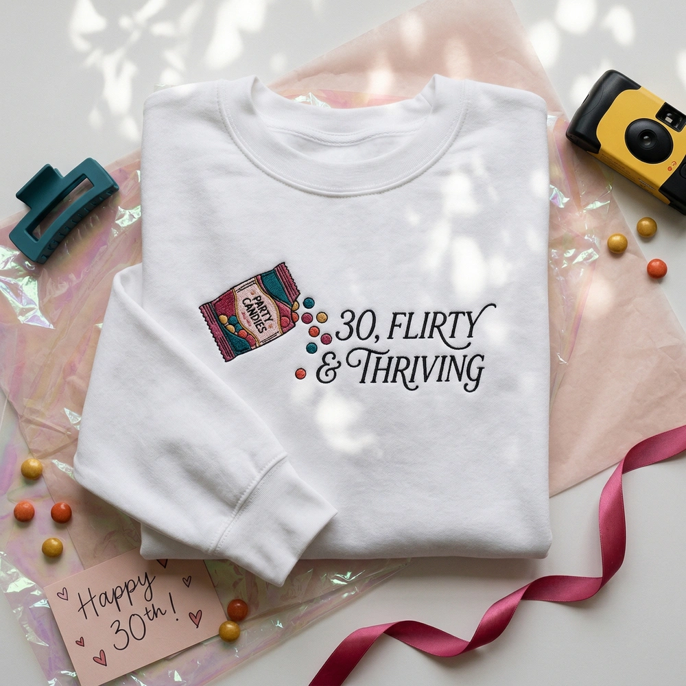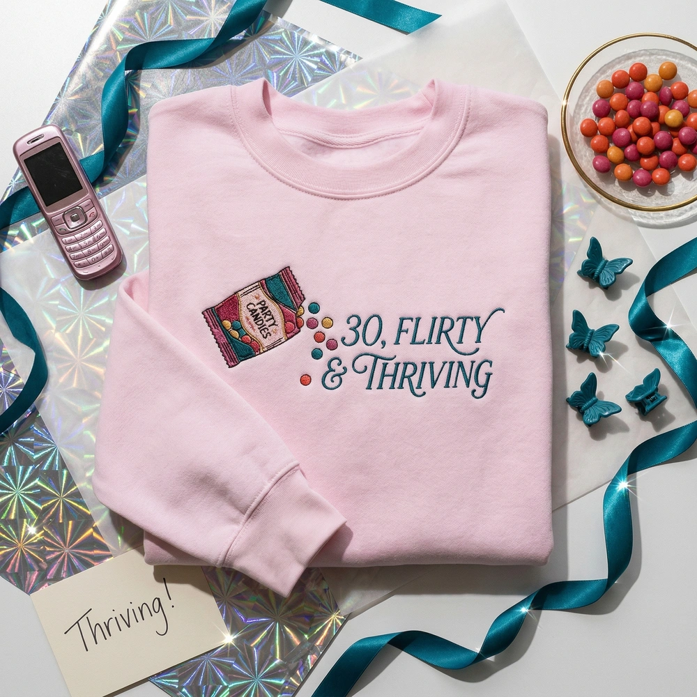 Step into your main character era with this nostalgic tribute to the early 2000s. Perfect for 30th birthday celebrations or anyone who lives for that Y2K aesthetic, this garment combines high-quality embroidery with a playful, glossy typography style. Whether you’re hosting a movie marathon or heading out for a birthday brunch, this piece ensures you stay “thirty, flirty, and thriving” in total comfort. Browse more embroidered sweatshirts or find your next favorite pop culture sweatshirt in our curated collection.