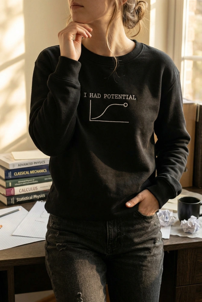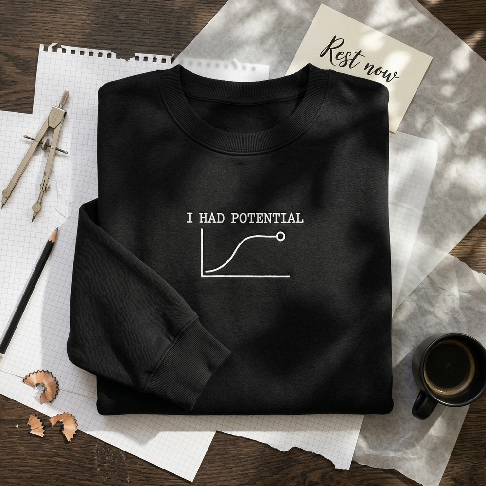 The Academic Burnout Graph Embroidered Sweatshirt features a minimalist “I HAD POTENTIAL” physics design, perfect for science nerds and gifted kids.