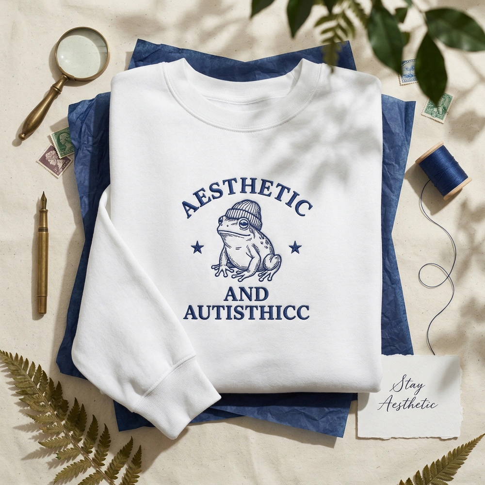 The Aesthetic and Autisthicc Embroidered Sweatshirt is a premium garment featuring a vintage-style frog in a winter beanie with navy blue stitching.