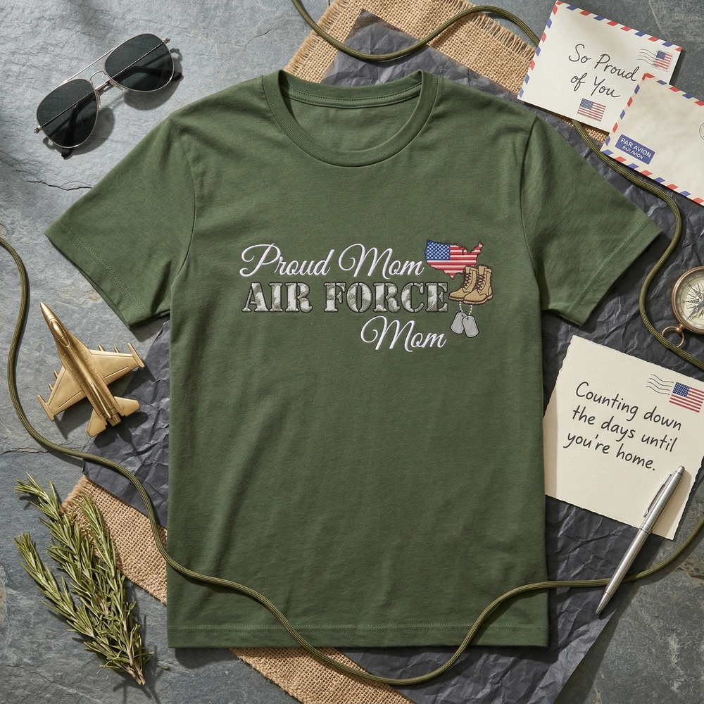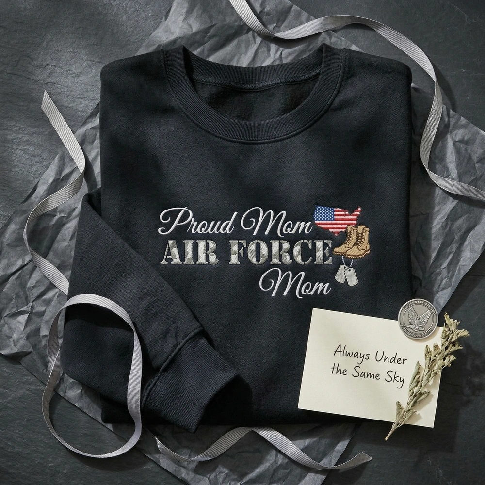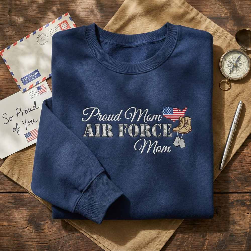 Wear your pride on your sleeve—literally. This personalized sweatshirt offers a tangible way for military families to stay connected to their Airman through every deployment and homecoming. Whether you are cheering at a basic training graduation or sending love across the globe, this high-density embroidery serves as a badge of honor for those who serve on the home front. Browse more embroidered sweatshirts or find the perfect mama sweatshirt in our dedicated collection.