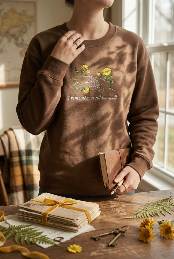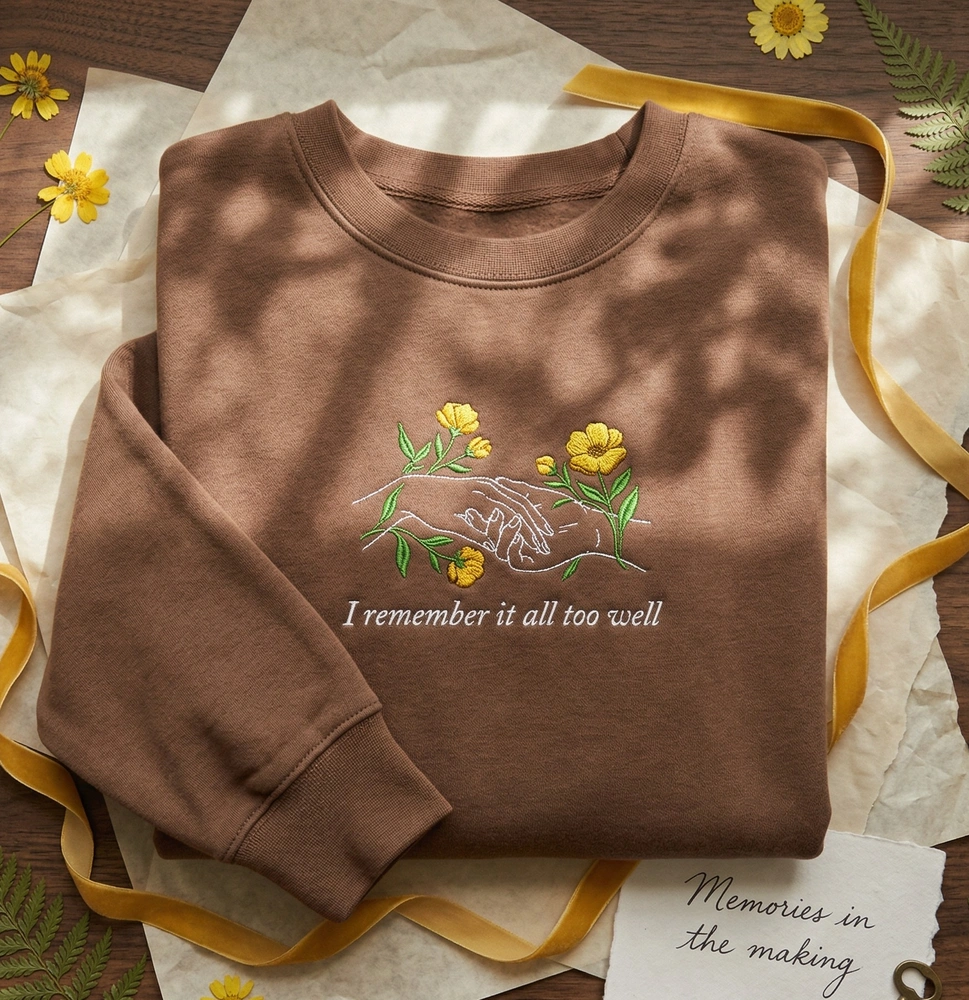 This design is meticulously rendered on a rich earthy brown sweatshirt, providing a warm and nostalgic backdrop for the intricate embroidery. The center chest features two interlocking hands in a light cream line-art style. Bursting from the wrists are vibrant golden yellow wildflowers and forest green foliage, symbolizing growth and memory. Below the illustration, the iconic lyric is embroidered in a classic serif font. We use a professional mix of satin stitches for the petals and precise running stitches for the fine text and line work. The total embroidery area measures approximately 12cm x 15cm, using four high-quality thread colors for a premium finish.