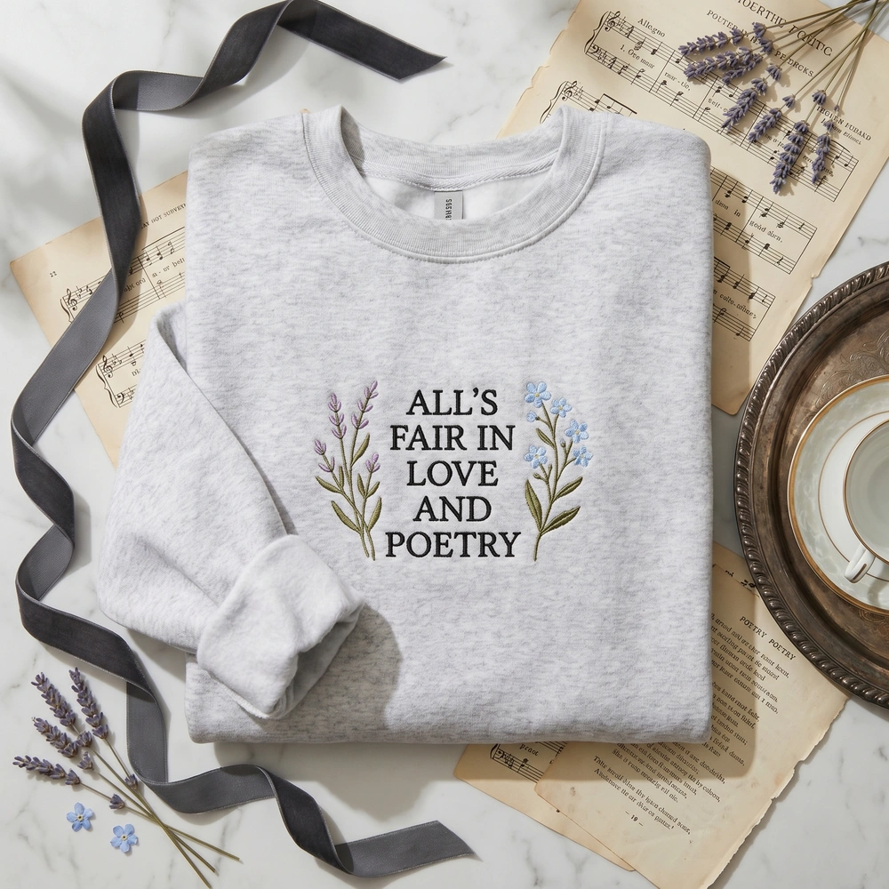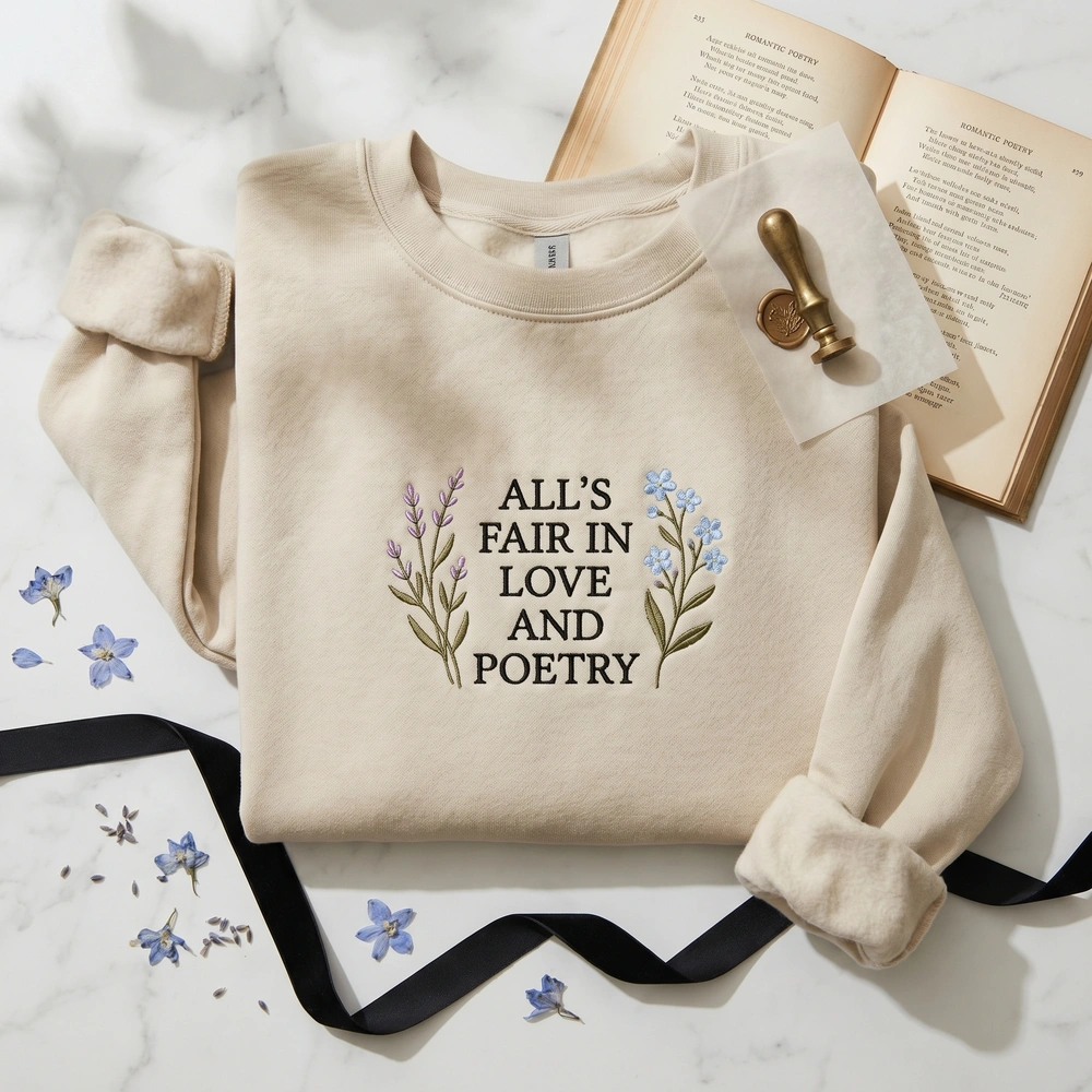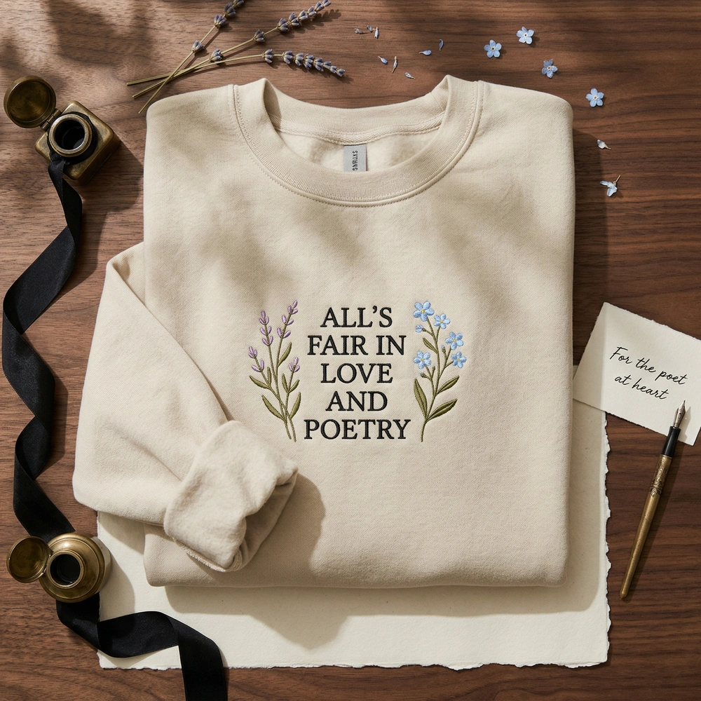 This design is meticulously crafted with high-density embroidery on a soft, light beige sand sweatshirt. The center-chest focal point features the text “ALL’S FAIR IN LOVE AND POETRY” stacked in a classic black serif font. To add a botanical touch, the quote is flanked by two minimalist floral sprigs: a purple lavender bud on the left and light blue forget-me-nots on the right. The embroidery measures approximately 15cm x 10cm and uses four distinct thread colors to ensure the floral details pop against the neutral fabric.