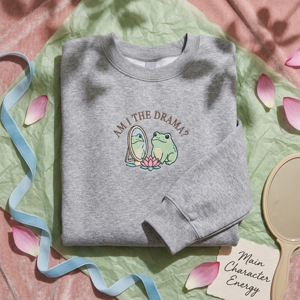 The Am I The Drama Embroidered Sweatshirt features a viral frog meme design, making it the perfect funny sweatshirt for frogcore and TikTok fans.