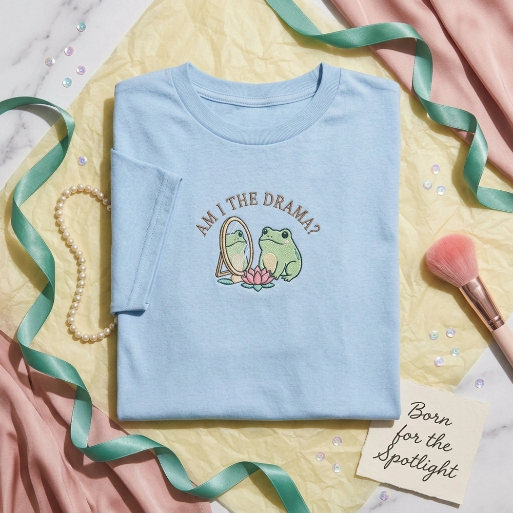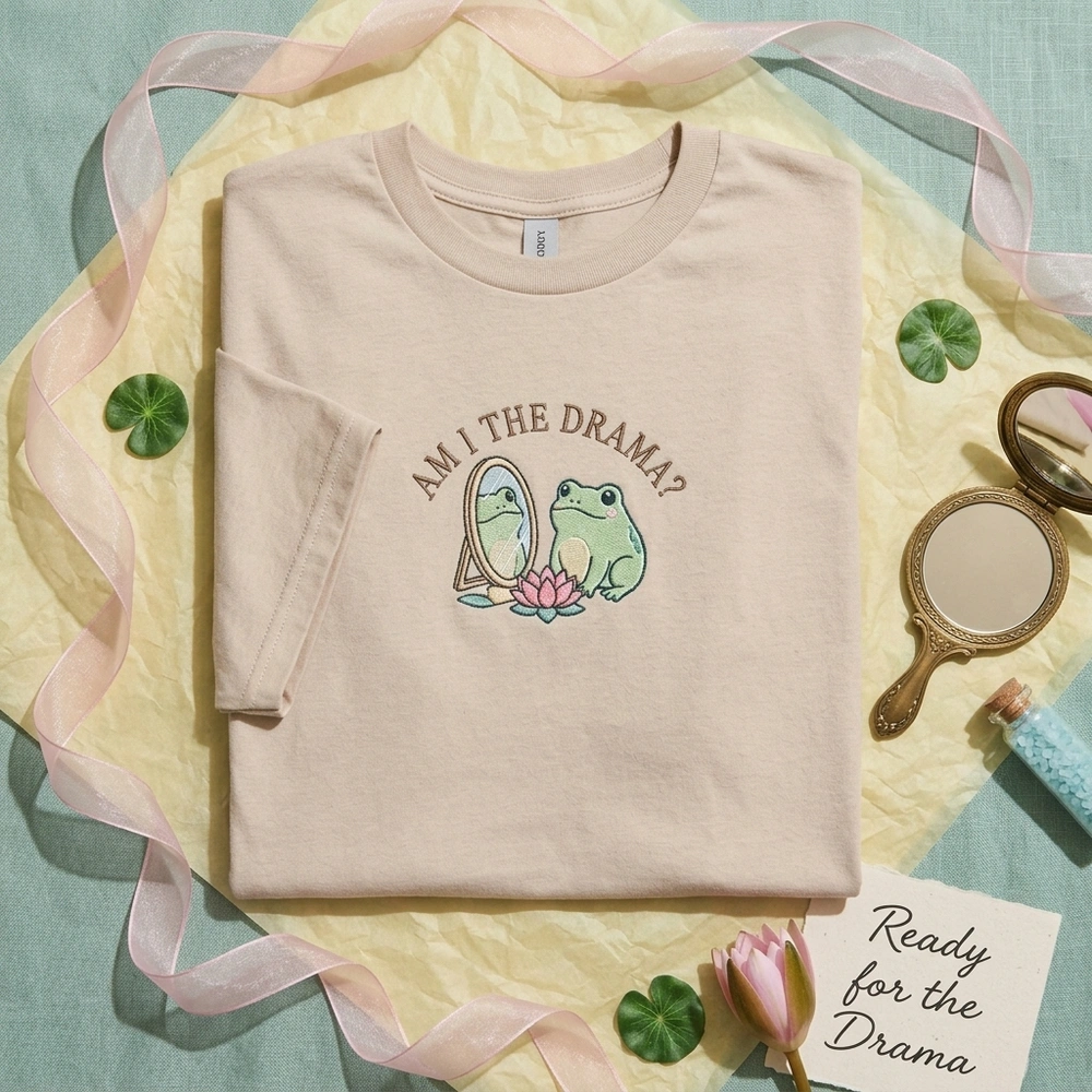 This exclusive design features a chubby, light green frog gazing into a vintage-style oval mirror, contemplating the iconic meme phrase ‘AM I THE DRAMA?’ arched above in bold black lettering. The composition is expertly rendered using 8 distinct thread colors, including Sage Green, Pale Pink, and Light Blue, against a classic Sport Grey fabric. Measuring 12cm x 14cm, the embroidery utilizes thick black satin stitch outlines for a ‘sticker-like’ pop, while the mirror reflection uses smooth tatami fill and white glare lines for illustrative depth. A delicate pink lotus flower grounds the beige frame, adding a touch of cottagecore elegance.