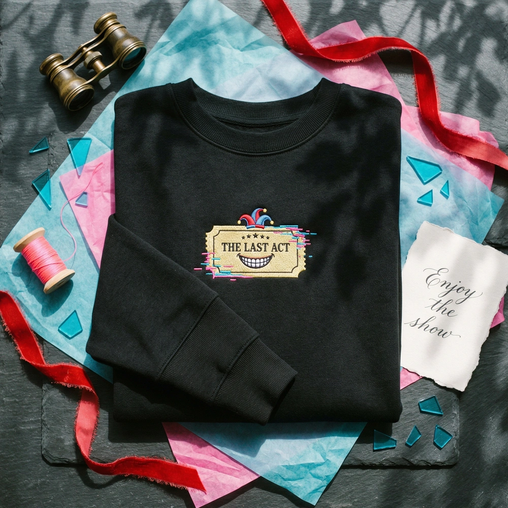 The Amazing Digital Circus Last Act Embroidered Sweatshirt features a surreal glitching theater ticket with Pomni’s jester hat and Caine’s iconic teeth barcode.