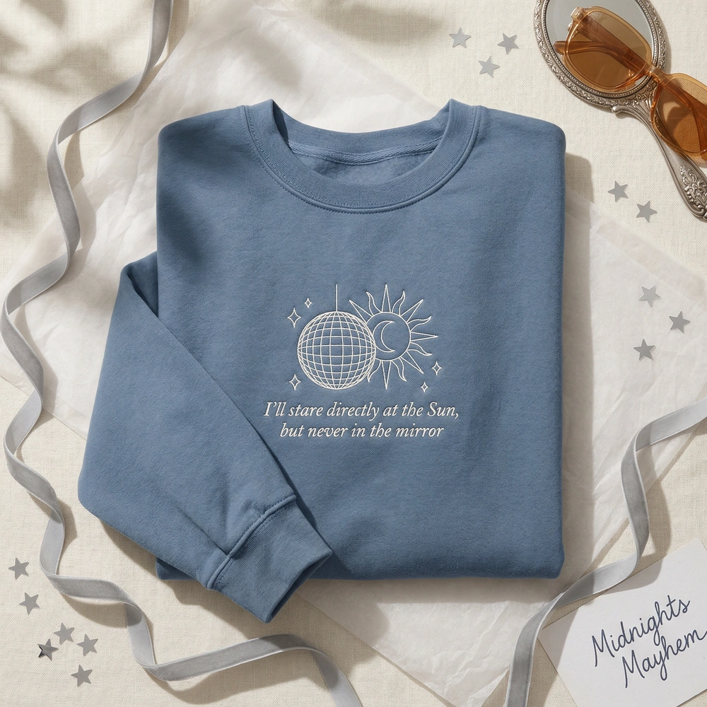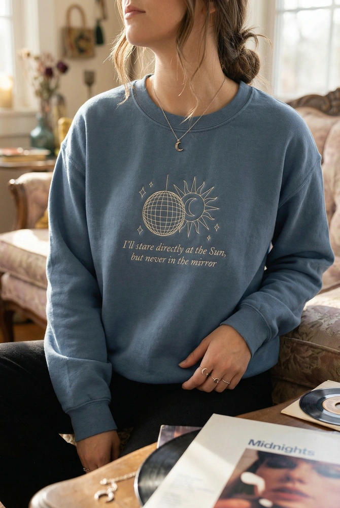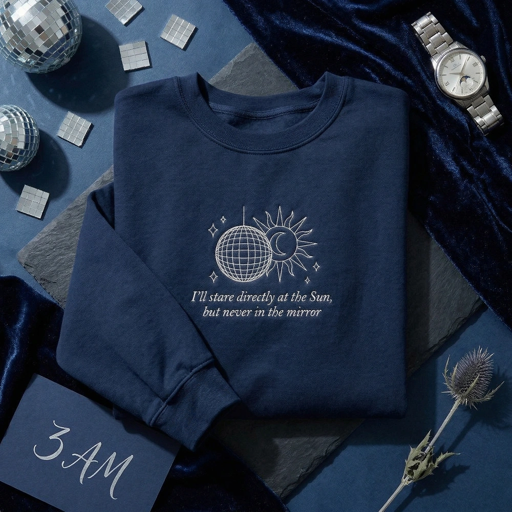 The Anti Hero Lyrics Embroidered Sweatshirt features a minimalist disco ball and sun design, perfect for fans of introspective lyrics and celestial art.