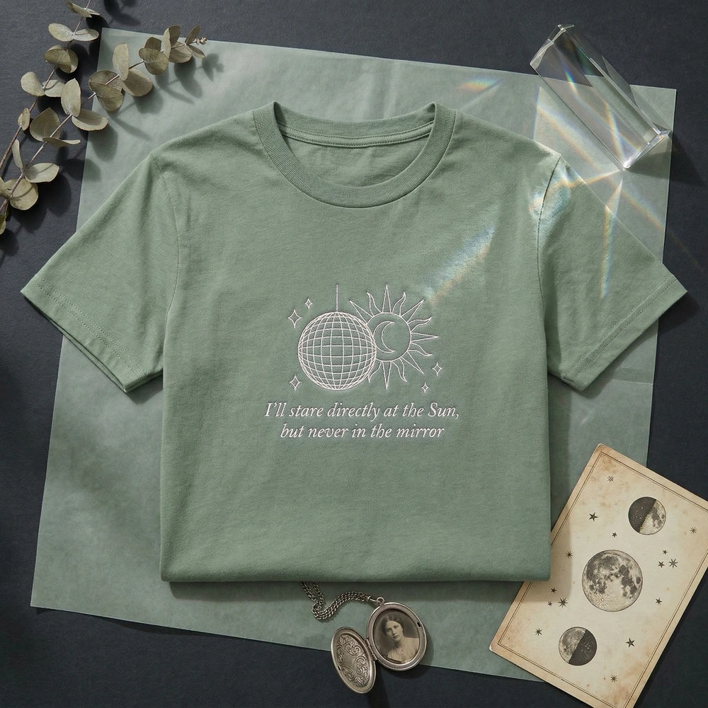 This design is inspired by the hit song featuring the lyrics about staring directly at the sun. It captures the aesthetic of a specific record-breaking musical era that focuses on self-reflection and retro-celestial imagery.