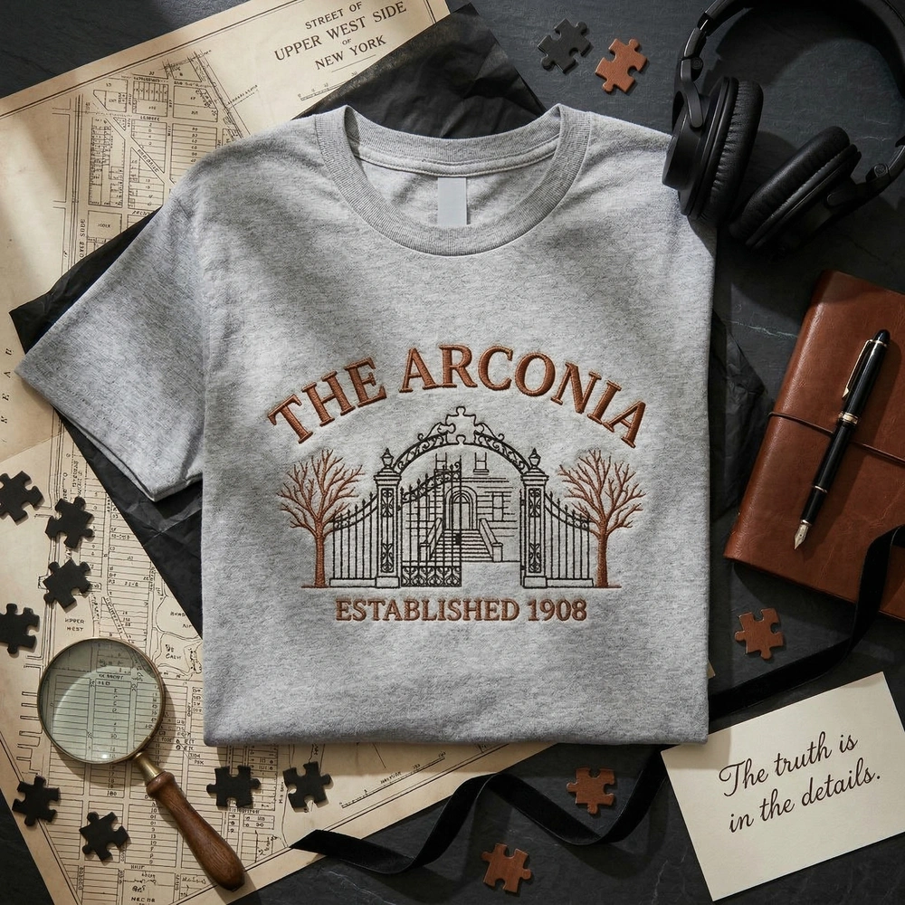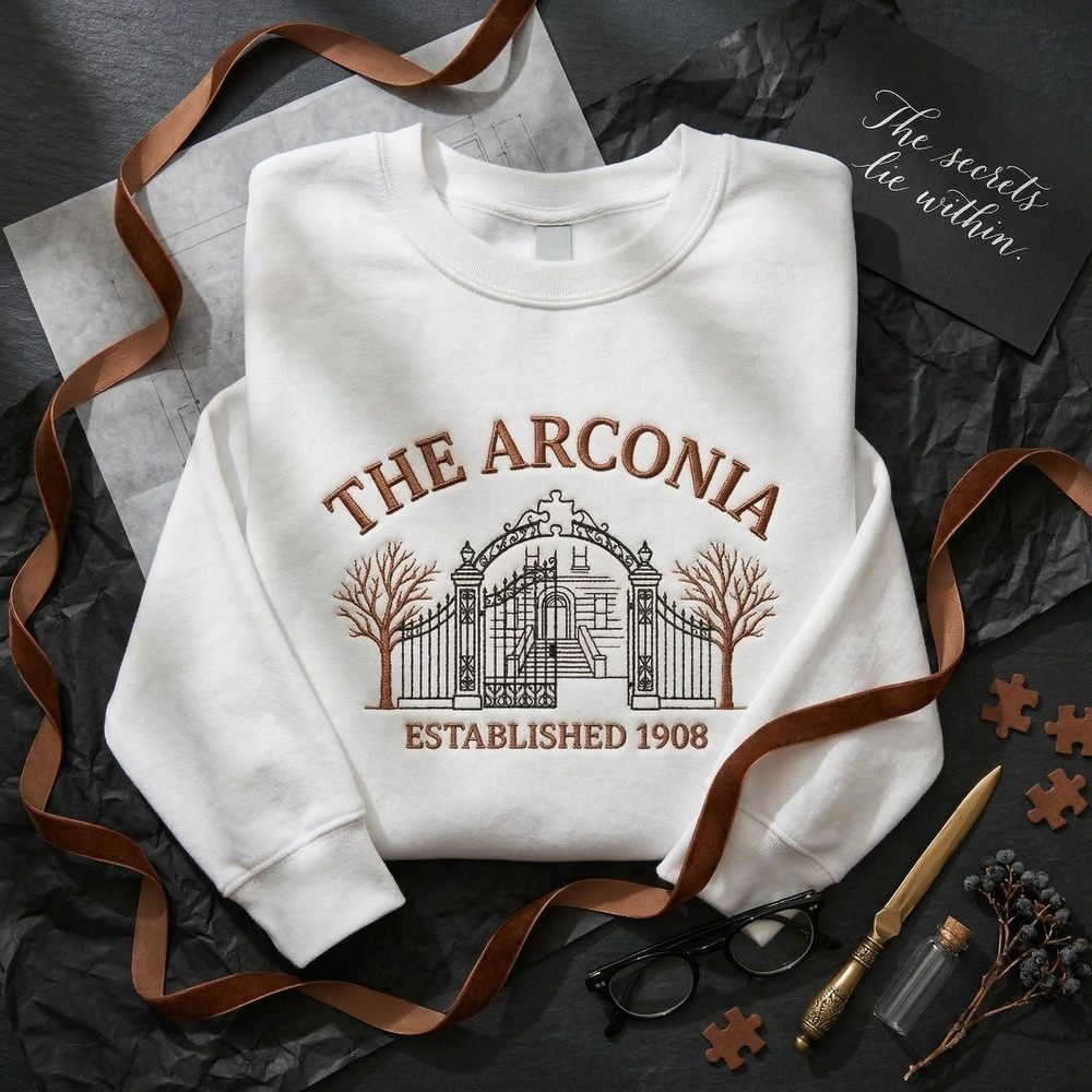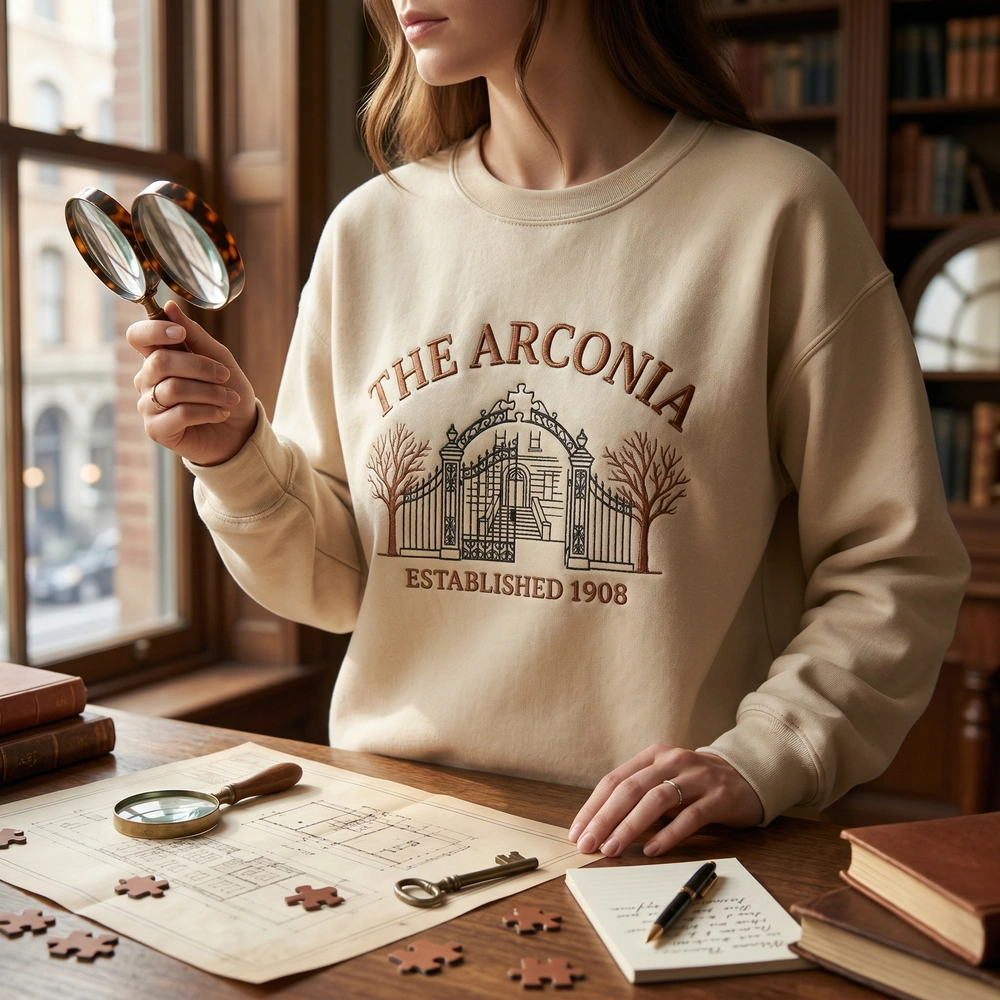 The Arconia Embroidered Sweatshirt is a premium machine-embroidered garment featuring an intricate architectural design for mystery and podcast fans.