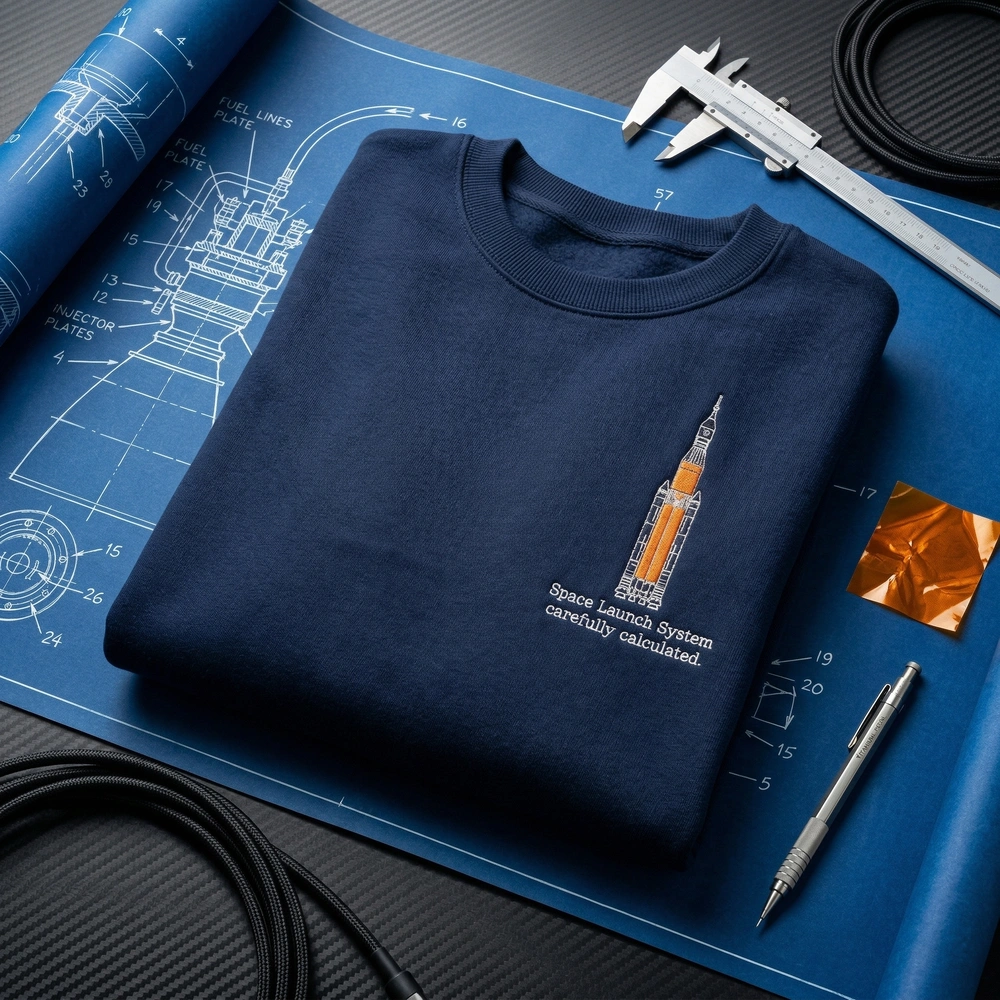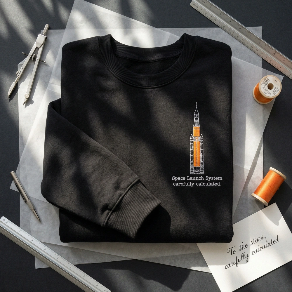 Our sweatshirts follow standard unisex sizing. For a true tech-wear or slightly oversized fit, we recommend sizing up. The embroidery is stabilized to ensure the technical lines of the SLS rocket stay crisp after many washes.
