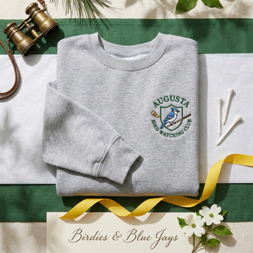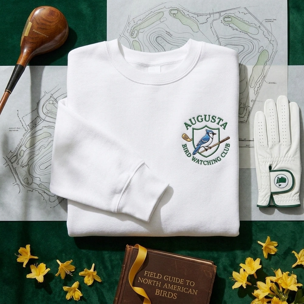 The Augusta Bird Watching Embroidered Sweatshirt is a premium ironic country club garment featuring a subtle, funny golf crest inspired by viral tournament style.