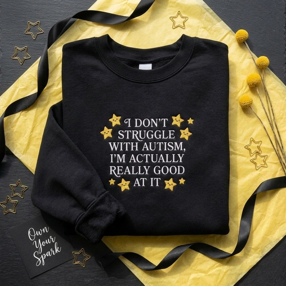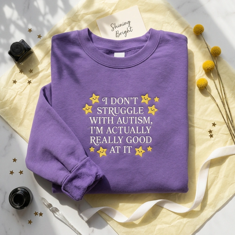 This design is meticulously rendered on a rich purple garment, creating a vibrant backdrop for the high-density embroidery. The focal point is the powerful statement “I DON’T STRUGGLE WITH AUTISM, I’M ACTUALLY REALLY GOOD AT IT” in crisp white, all-caps handwritten typography. Surrounding the text are seven whimsical, five-pointed yellow stars, each featuring a minimalist “kawaii” smiling face for a touch of approachable charm. The embroidery spans approximately 28cm x 12cm, utilizing premium satin and fill stitches to provide a raised, high-end feel that resists fading and wear.