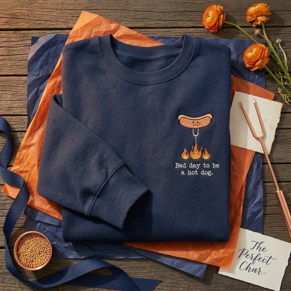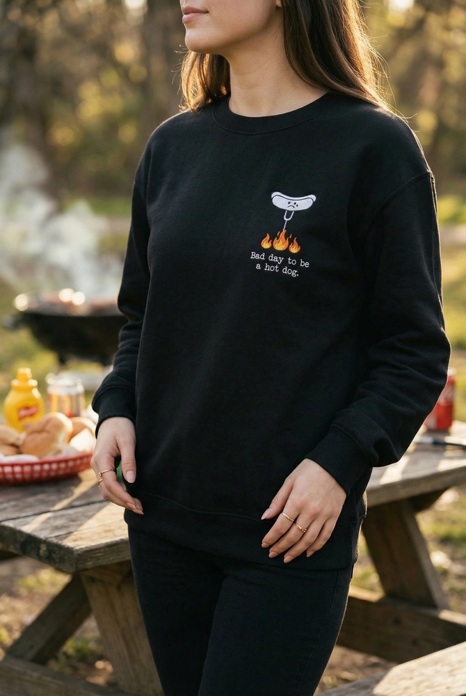 The Bad Day To Be A Hot Dog Embroidered Sweatshirt features a tiny, minimalist anxious hot dog on a fork—a perfect subtle meme for ironic humor fans.