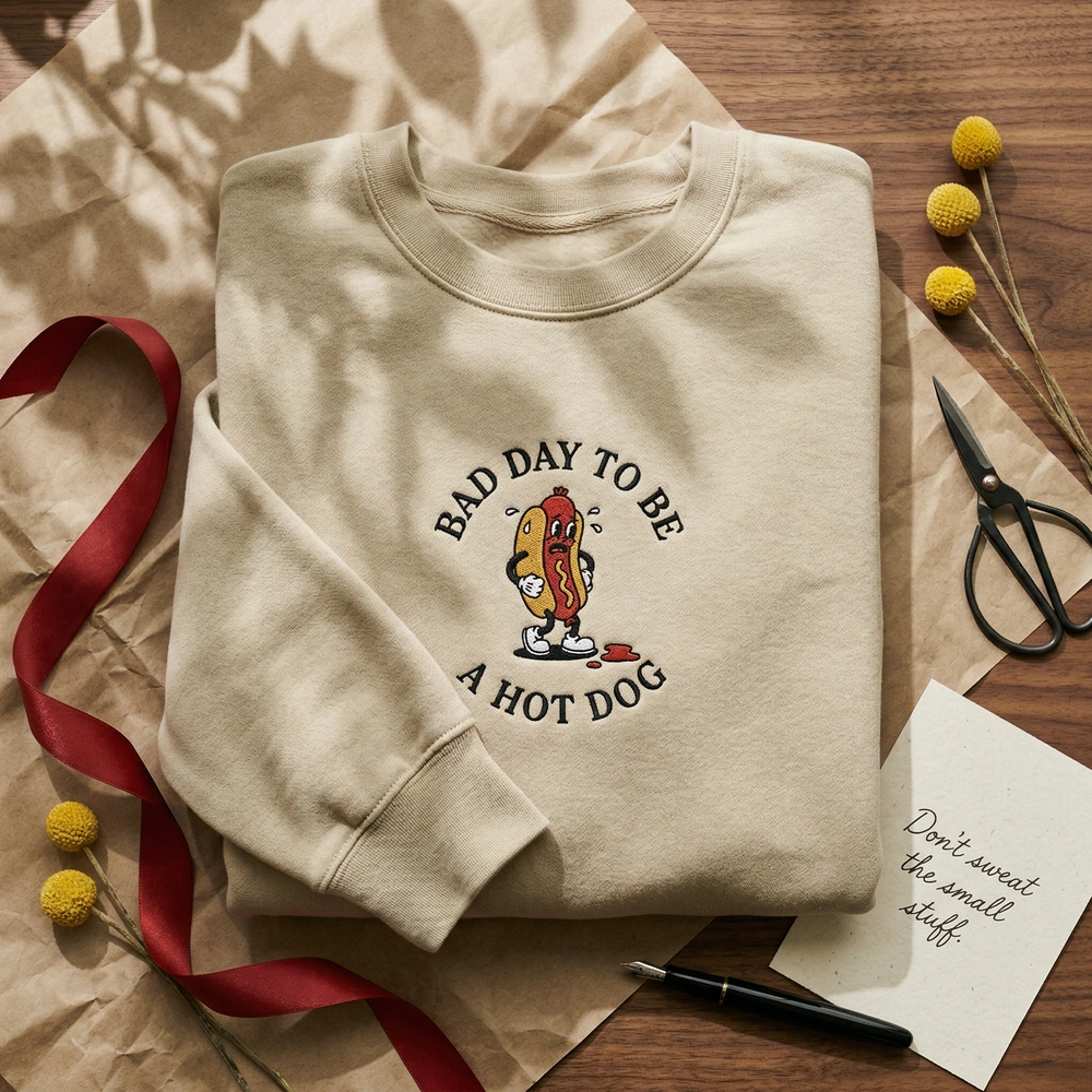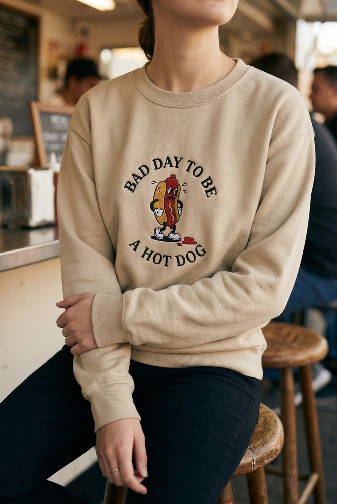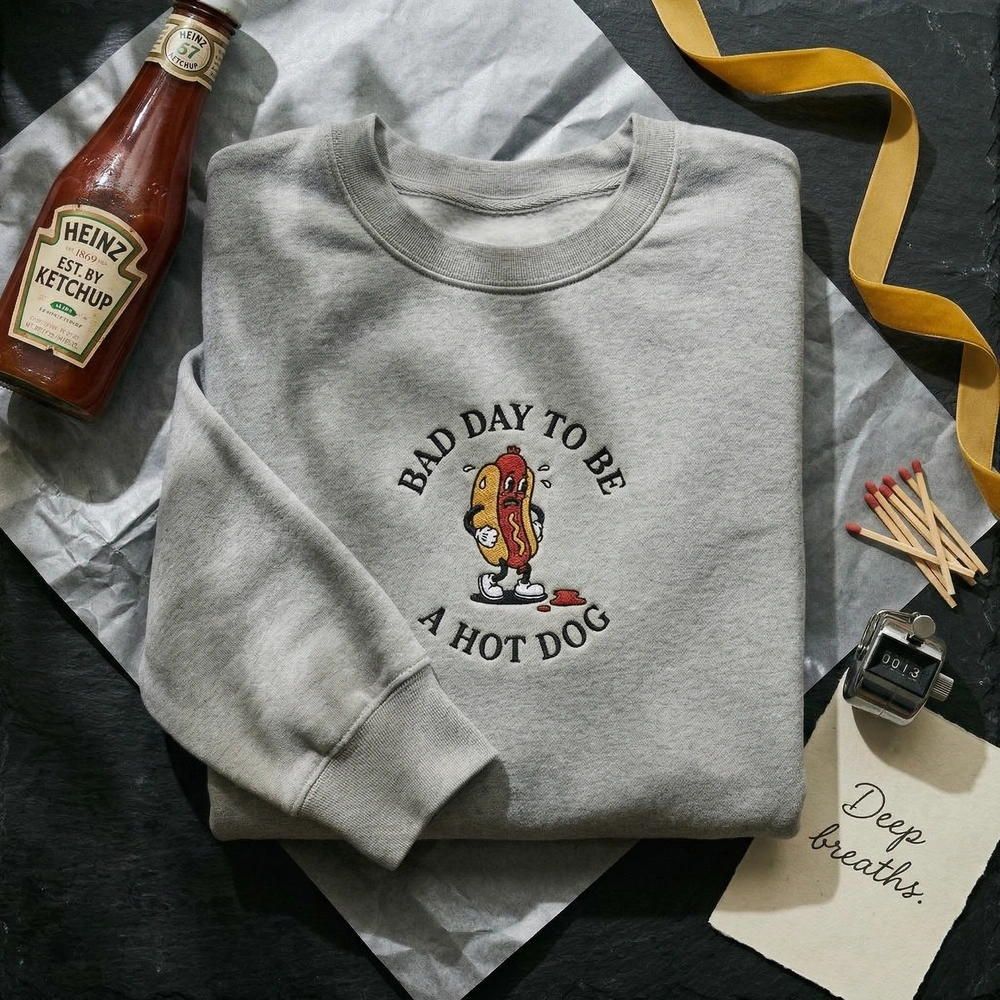 Embrace the absurdity of internet culture with this high-quality garment that blends vintage aesthetics with modern streetwear trends. Whether you’re navigating a stressful day or just appreciate the “bad day to be a hot dog” energy, this piece is designed to turn heads and spark conversations. Browse more embroidered sweatshirts in our collection to find your next favorite ironic look.