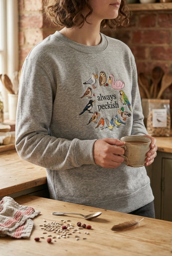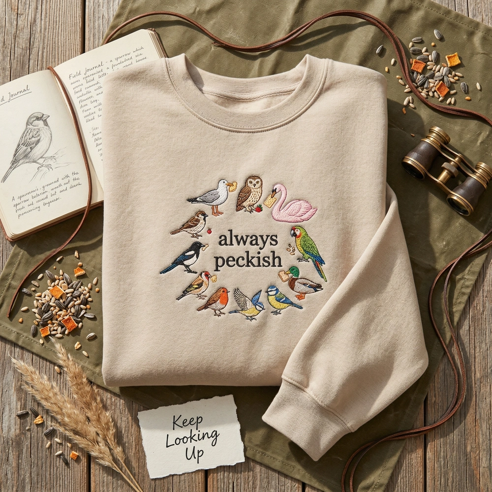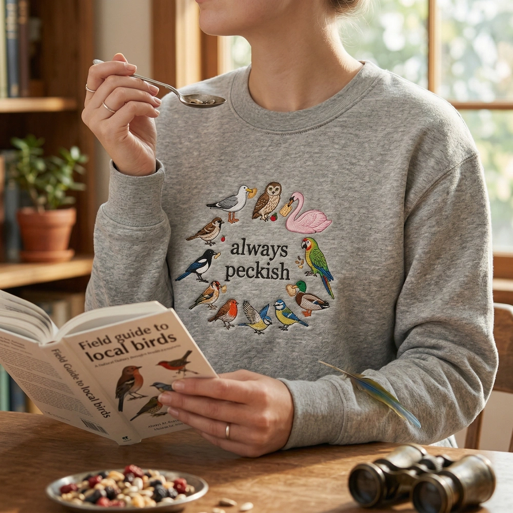 This Bird Lover Gift Embroidered Sweatshirt features the Always Peckish design, a hilarious tribute to hungry birds and birders with a sense of humor.