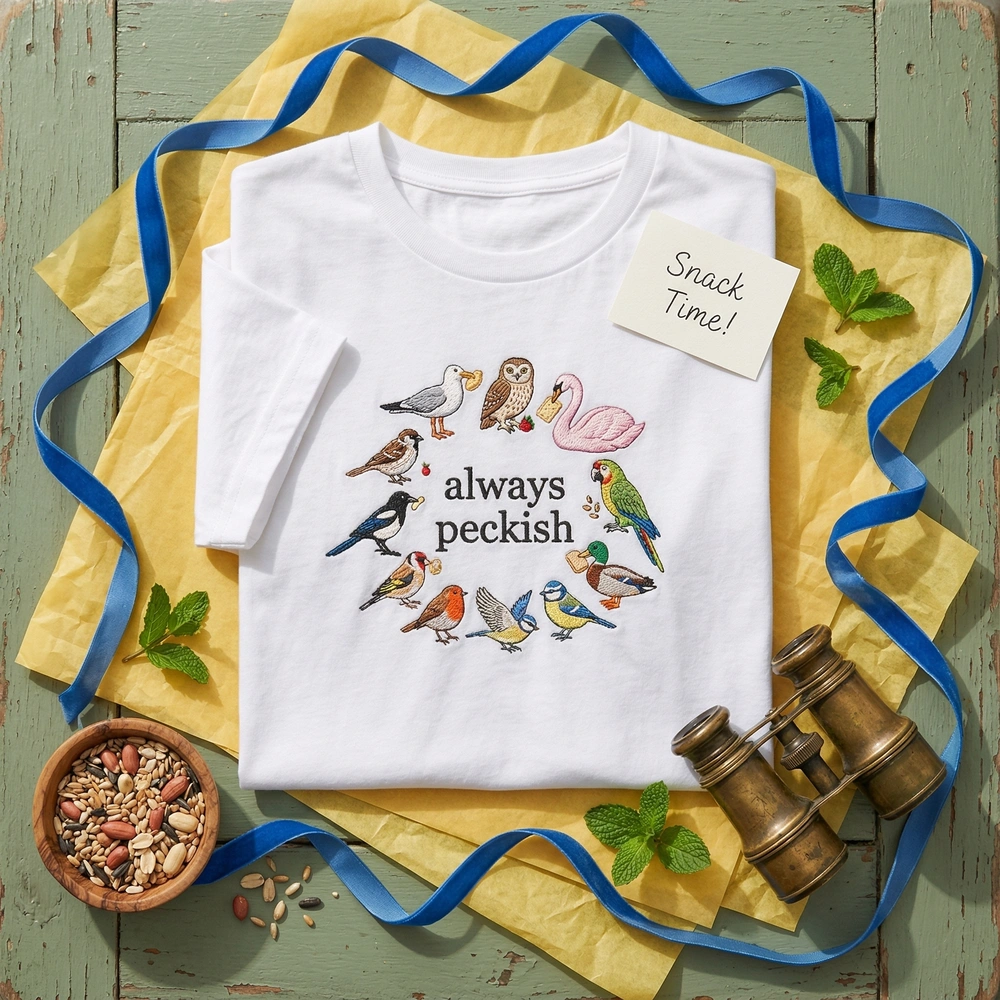 This intricate center-chest composition measures 12cm x 10cm and is brought to life with over 12 vibrant thread colors on a classic Sport Grey garment. The design features ten distinct bird species, including a seagull clutching a chip, an owl with a french fry, and a mallard duck standing over spilled fries. Using a mix of dense satin stitches for the “always peckish” text and textured fill stitches for the birds’ bodies, the embroidery creates a stunning three-dimensional effect. From the forest greens of the parrot to the electric blues and sunny yellows of the smaller birds, the level of detail in the beaks and feathers showcases true machine-embroidery expertise.