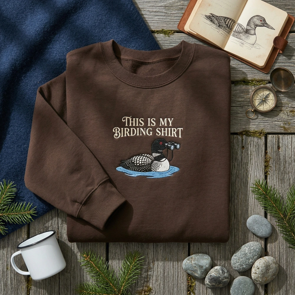This original illustration is expertly rendered on a rich Espresso Brown garment, providing a warm, earthy backdrop for the vibrant embroidery. The design measures 12cm x 10cm and features 4 high-quality thread colors: crisp White, deep Black, striking Red for the loon’s eyes, and Dodger Blue for the water puddle. The loon’s signature checkered back is achieved through intricate white satin stitching, while the playful text “THIS IS MY BIRDING SHIRT” is embroidered in an irregular font to match the whimsical theme.