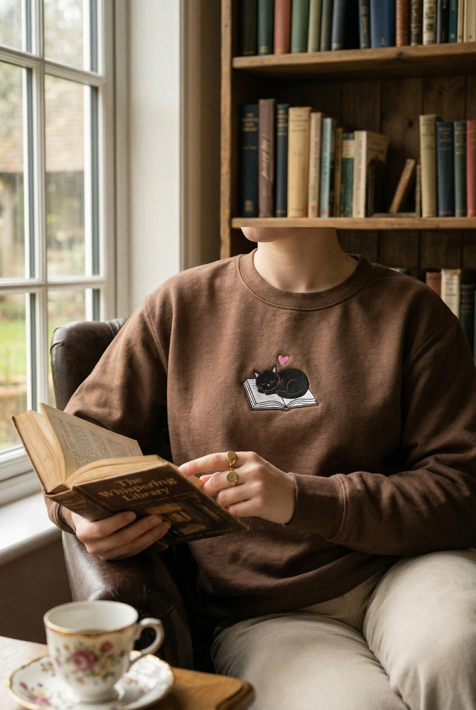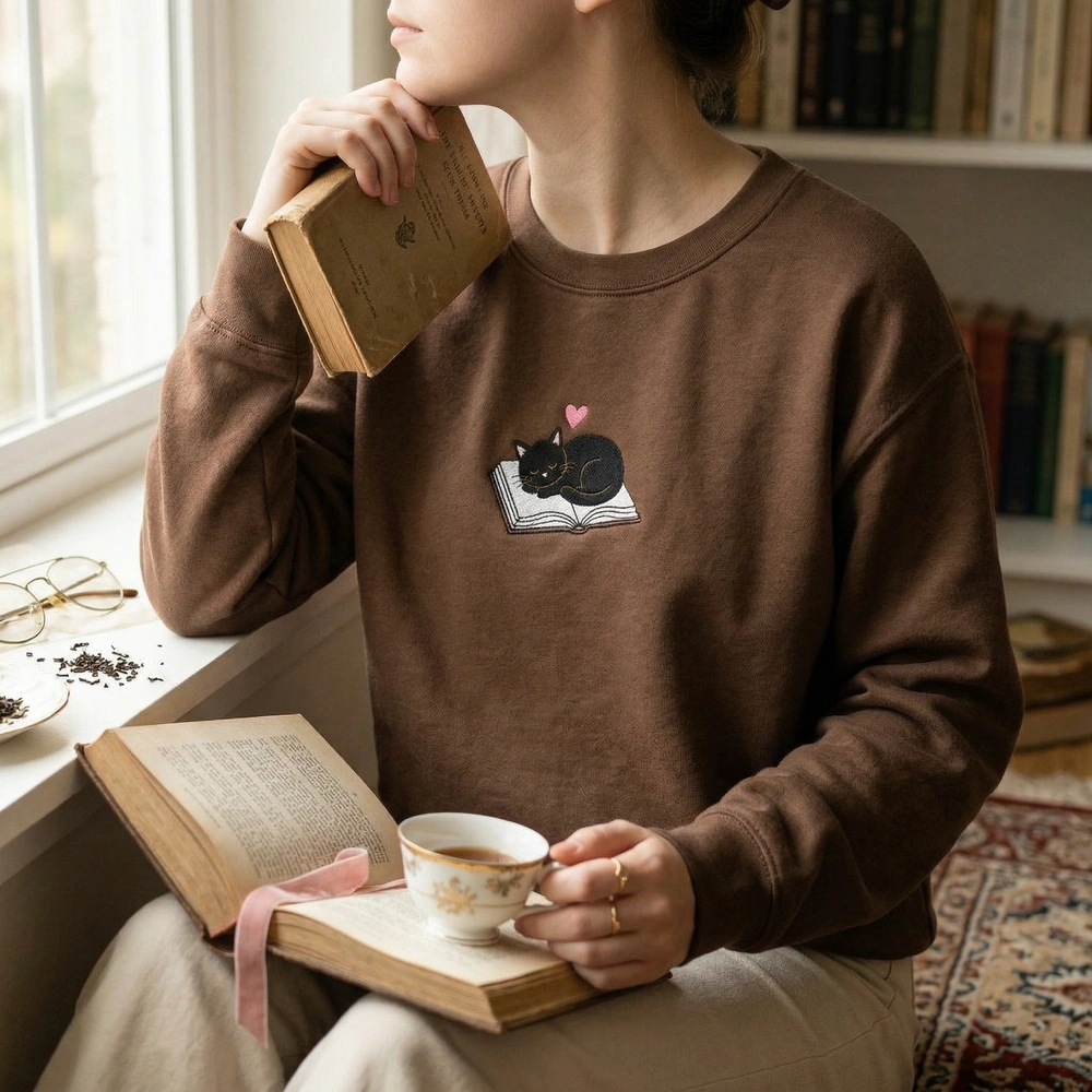 Embrace the ultimate “cozy night in” vibe with this charming design that celebrates the quiet joy of reading with a feline companion. Whether you are browsing for your next read or heading to a book club meeting, this piece connects you to the vibrant BookTok community and fellow cat enthusiasts. Browse more embroidered sweatshirts | cat sweatshirt in our collection to find your perfect match.