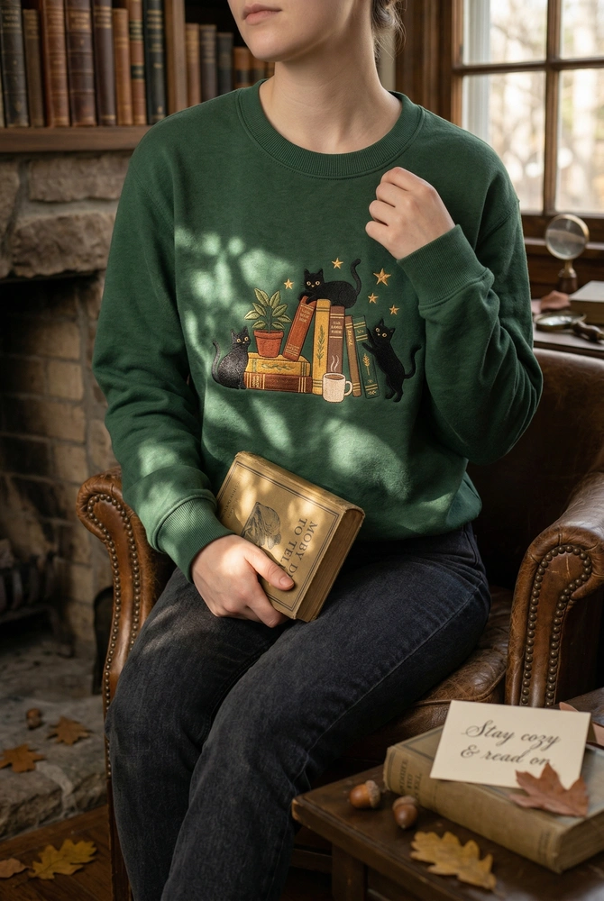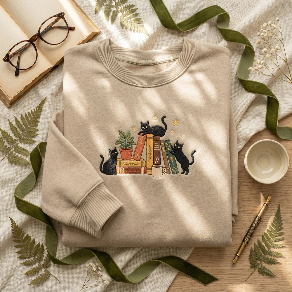 The Bookish Cat Embroidered Sweatshirt is a premium machine-embroidered garment featuring four playful black cats on vintage books—a must-have for dark academia fans.