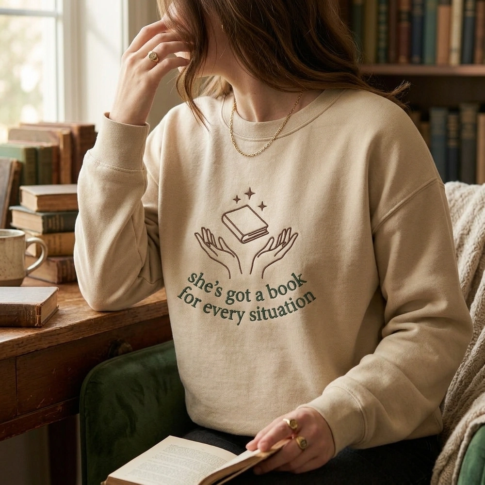 This Bookish Embroidered Sweatshirt features a minimalist “book for every situation” design, making it the ultimate cozy apparel for dedicated readers and fans of literary icons.