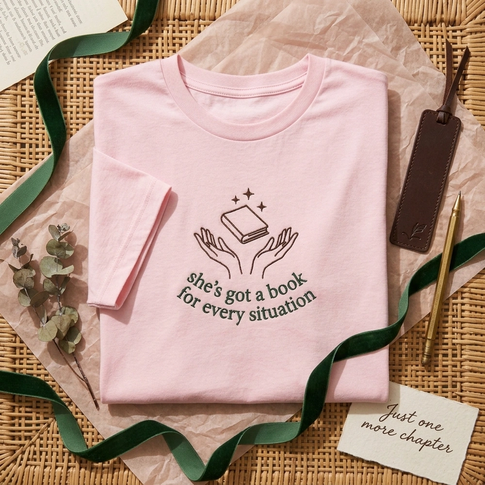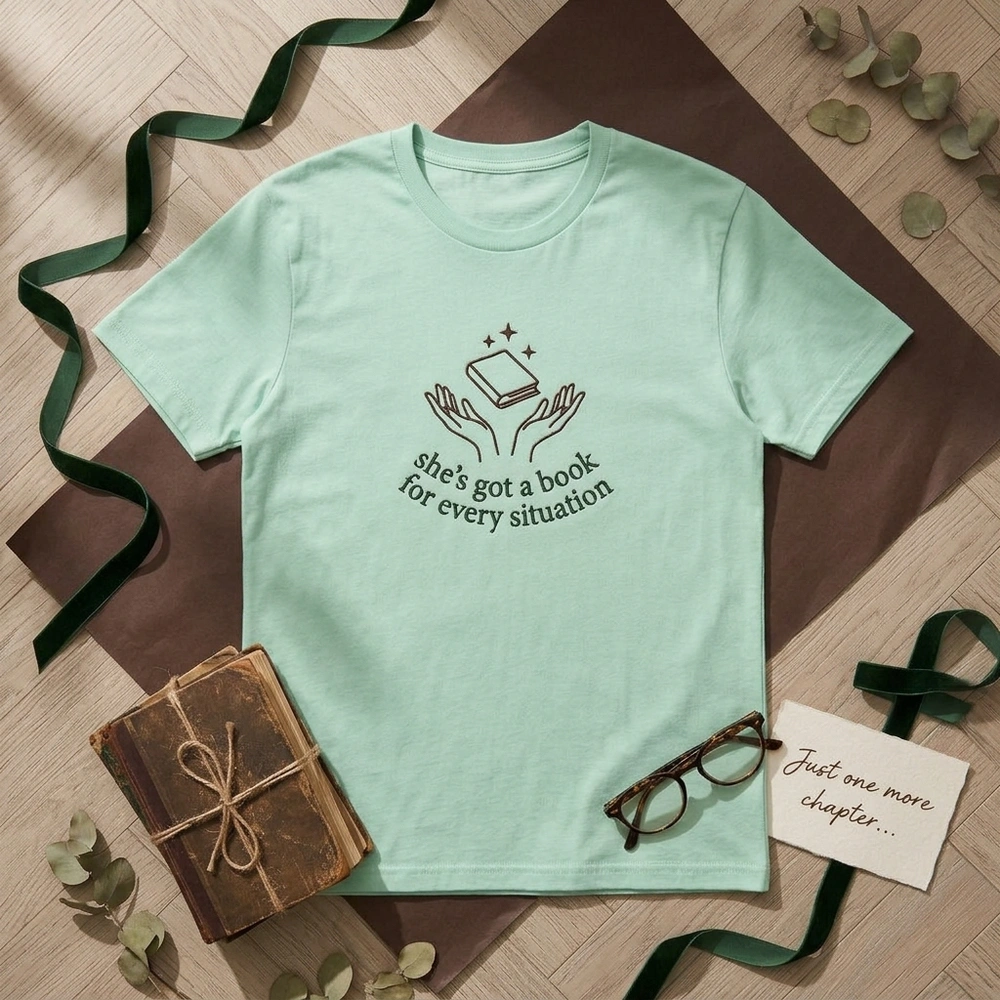 This design is meticulously rendered in a sophisticated two-color palette on a warm sand-colored garment. The central motif features dark chocolate brown (#3E2723) line art of two open hands lifting a book toward three delicate starbursts. Arched beneath the hands is the iconic quote “she’s got a book for every situation” in a deep forest green (#1B5E20) serif font. The embroidery measures 12cm x 10cm and uses a combination of precise running stitches for the minimalist linework and dense satin stitches for the high-quality text finish.