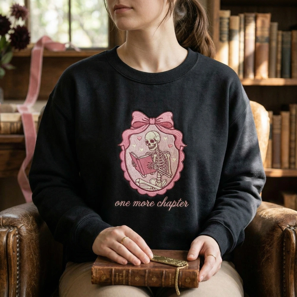 The Bookish Embroidered Sweatshirt is a premium machine-embroidered top featuring a coquette skeleton reading ‘One More Chapter’ in a pink bow frame—the ultimate gift for readers.