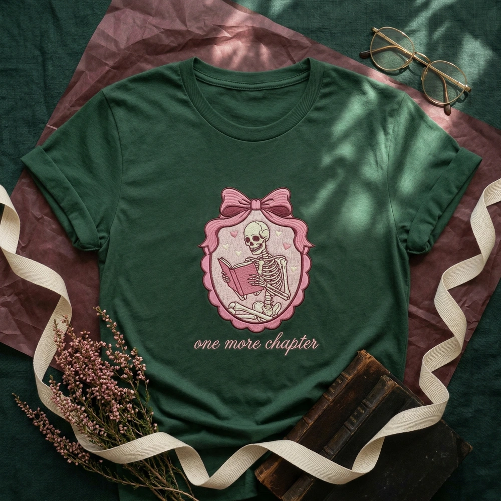This design taps into the ‘One More Chapter’ bookish trope and the ‘Coquette’ fashion trend popular on social media. It combines the traditionally dark skeleton imagery with feminine elements like pink bows and hearts, often referred to as ‘Spooky Coquette’ or ‘Soft Goth’.