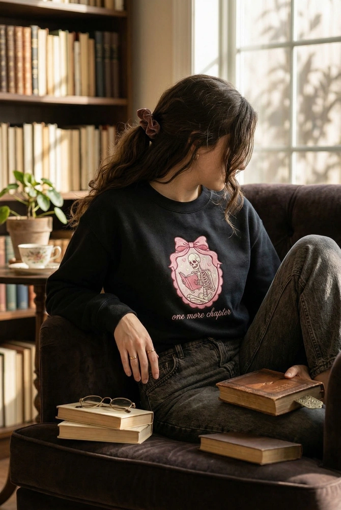 Celebrate your love for literature with this unique piece that perfectly blends the ‘spooky’ skeleton motif with the ultra-feminine coquette aesthetic. Whether you are scrolling through BookTok or curling up with a new release, this soft garment offers the comfort you need for a long reading session. Browse more embroidered sweatshirts or find your next halloween sweatshirt in our curated collection of bookish apparel.