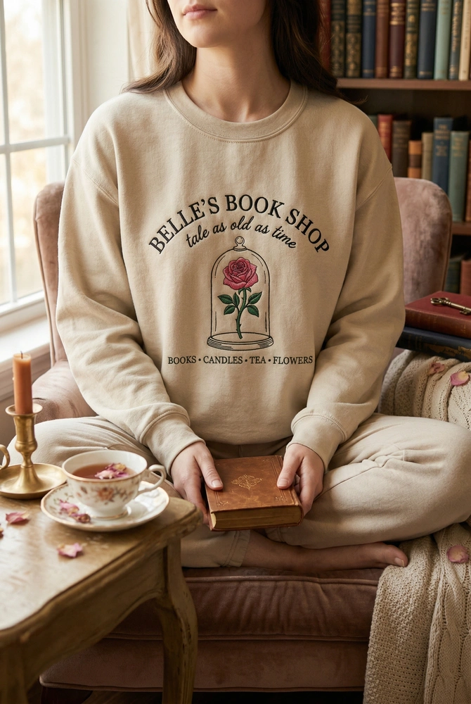 The Bookish Embroidered Sweatshirt is a premium machine-embroidered top featuring an enchanted library design — a cozy tribute to classic fairytales.