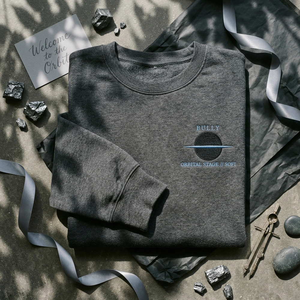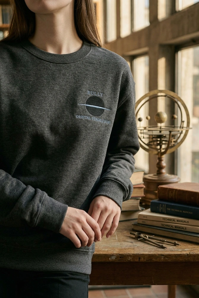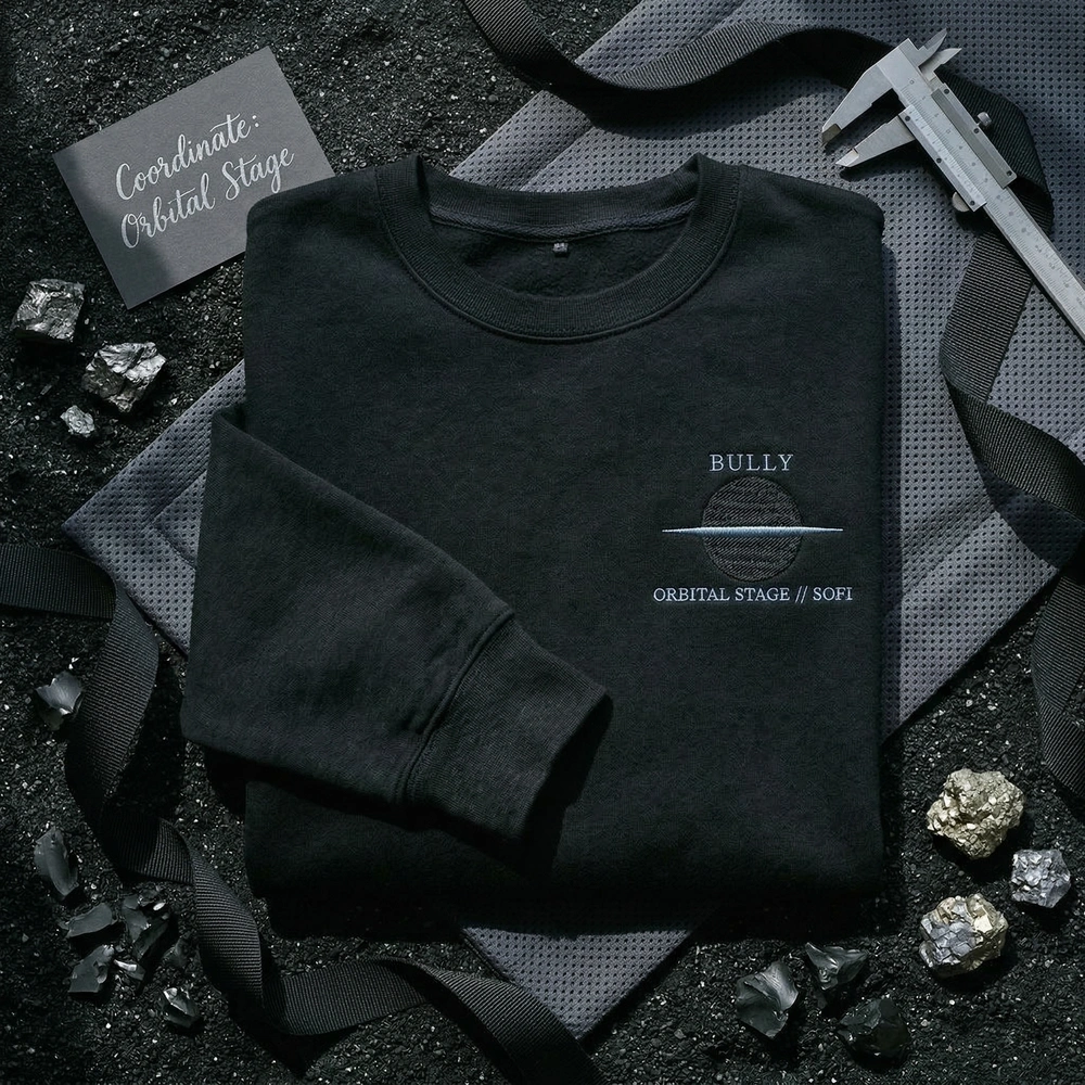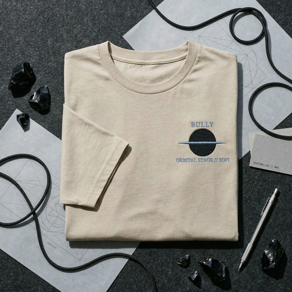 This design is expertly rendered on a Dark Heather garment, providing a muted, industrial backdrop for the heavy-stitched embroidery. The 8cm x 8cm left-chest logo features a pitch-black orb undergoing an eclipse, sliced by a sharp horizontal line. Above the orb, the word “BULLY” is embroidered in a crisp, futuristic technical font, while “ORBITAL STAGE // SOFI” sits below in ultra-fine micro-text. Using a specialized two-color palette of Pitch Black and Steel Blue/Grey, the embroidery relies on negative space to create a cryptic, three-dimensional effect.