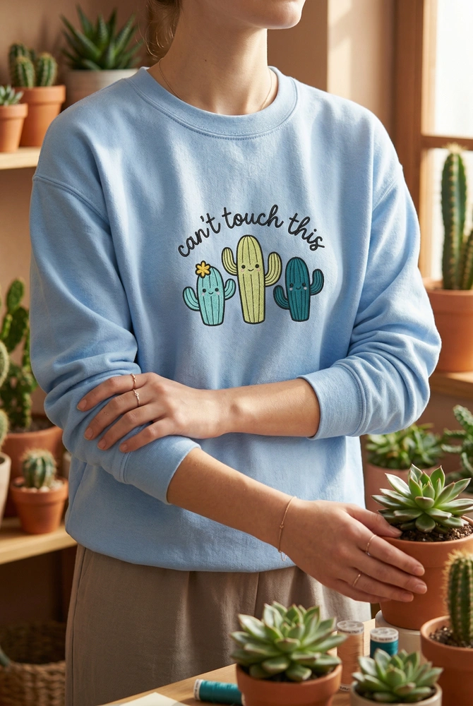 This Cactus Embroidered Sweatshirt features a funny kawaii succulent design with “can’t touch this” text, making it the perfect gift for plant lovers.