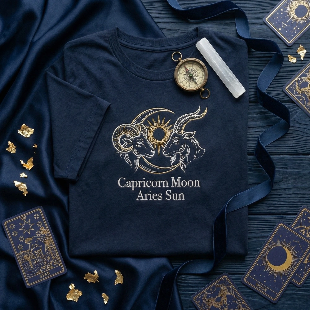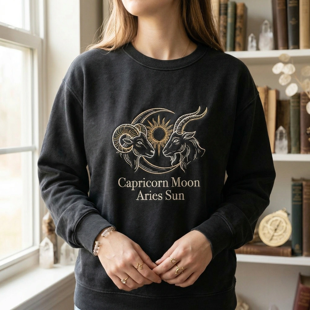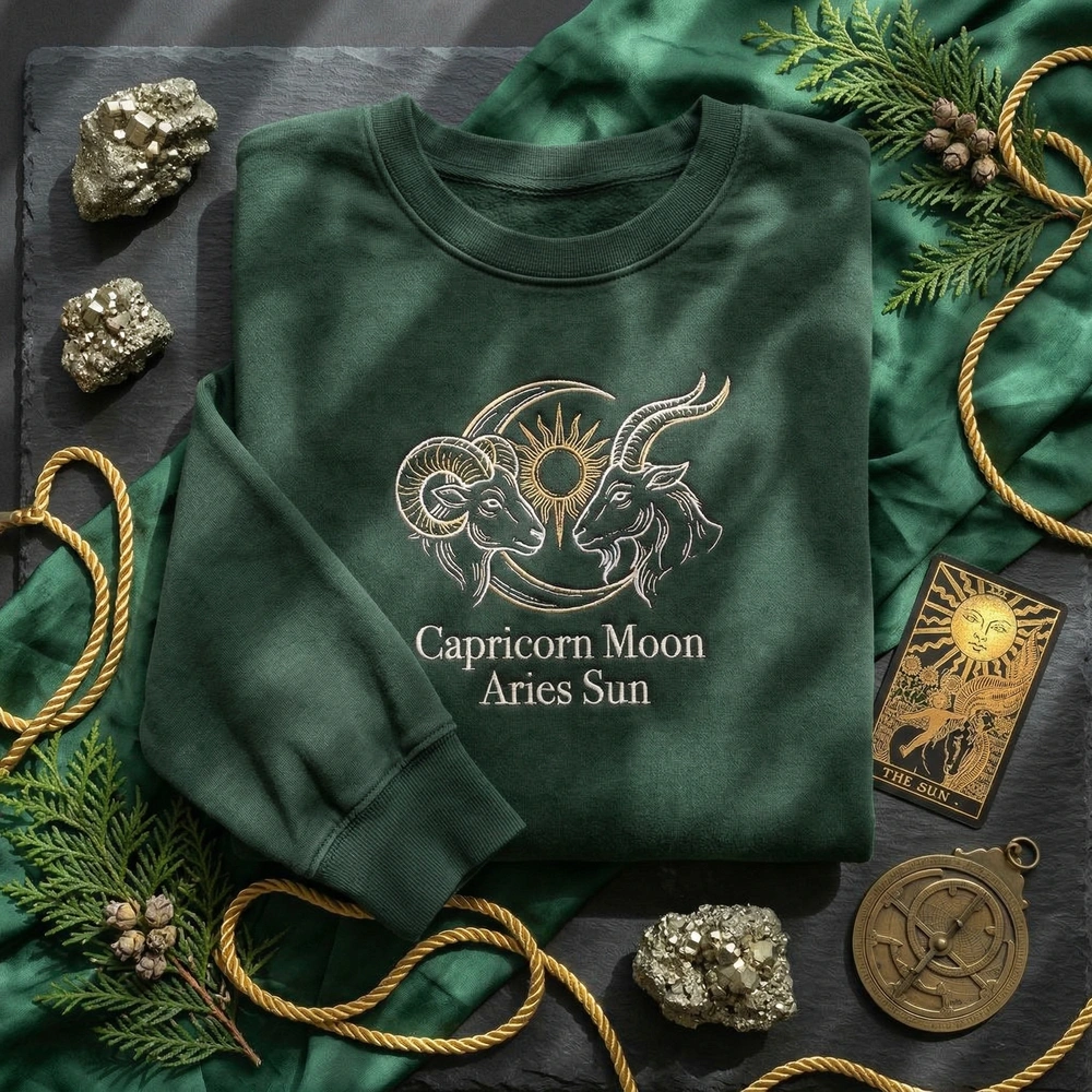 The Capricorn Moon Aries Sun Embroidered Sweatshirt is a premium machine-embroidered garment featuring a mystical alignment designed for the April 8, 2026 wealth shift.
