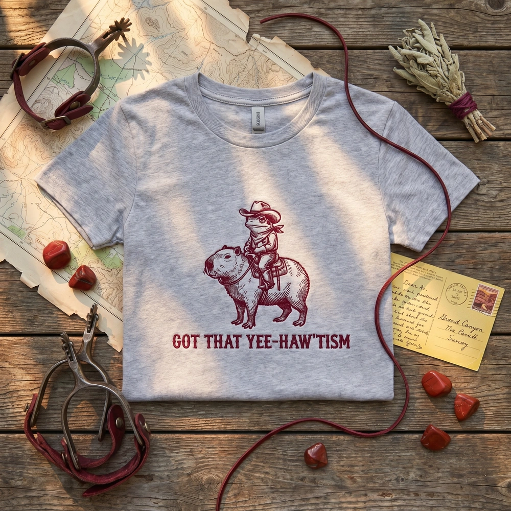 This design is a playful reference to the “Yee-haw’tism” internet meme, which is a popular pun used within the neurodivergent community to express identity and pride through humor. It combines the trendy western “yeehaw” aesthetic with a celebration of being neurospicy.