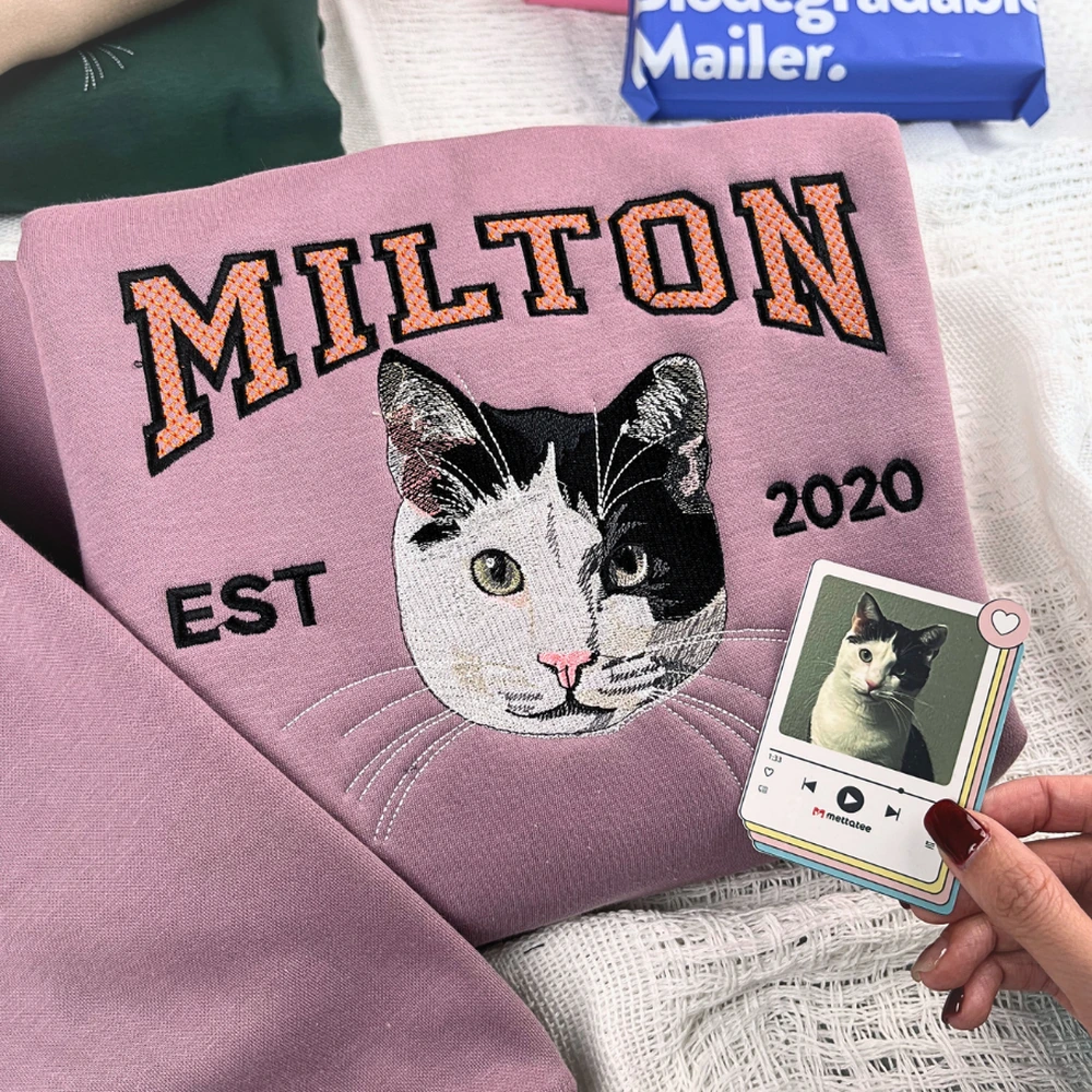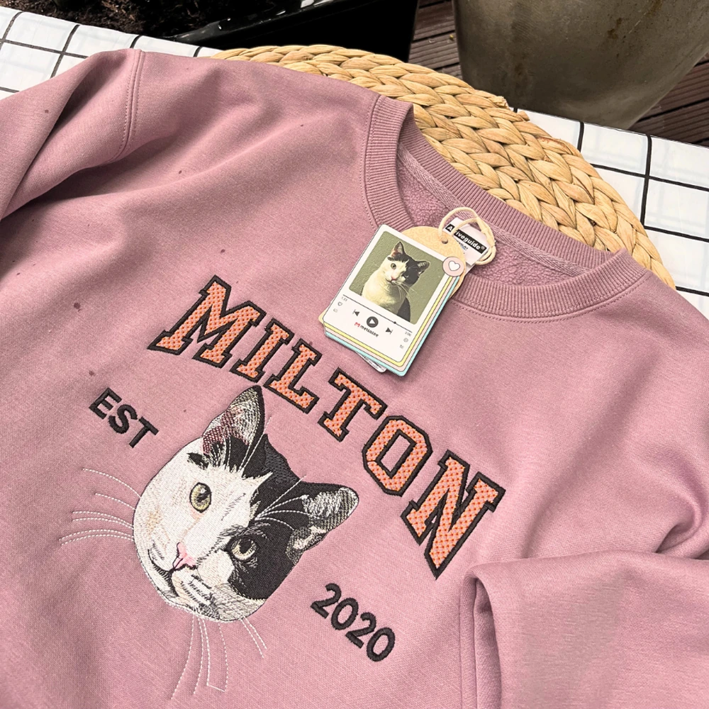 Turn your favorite photo into a custom cat sweatshirt. This beautifully embroidered cat portrait is the ultimate personalized gift for pet parents.
