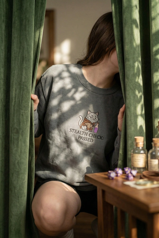 Anyone who has ever lived with a cat knows that “stealth” is a state of mind. Whether they are hiding behind a single blade of grass or a thin curtain with their tail clearly visible, their confidence is unmatched. This design captures that hilarious energy by merging the classic “cat logic” fail with a tabletop RPG twist. If you are looking for a unique way to celebrate your love for gaming and felines, our embroidered sweatshirts offer the perfect blend of comfort and niche humor.