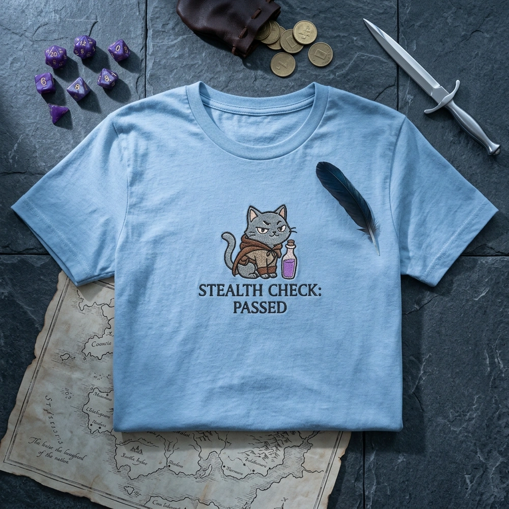 This design is a humorous nod to the “Stealth Check” mechanic found in popular tabletop role-playing games like Dungeons & Dragons. It pairs the high-stakes world of fantasy rogues with the relatable, unearned confidence of a house cat who thinks they are perfectly hidden behind a tiny object.