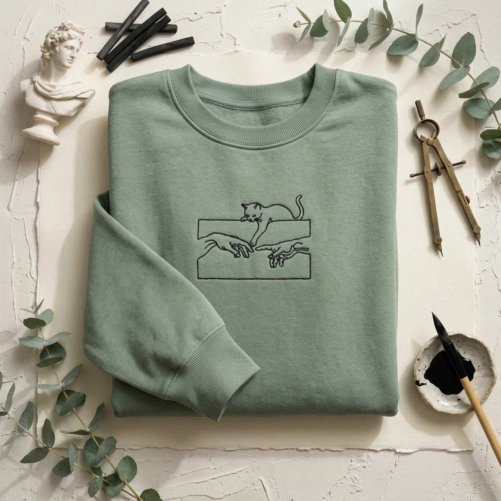 The Cat Lover Gift Embroidered Sweatshirt is a premium machine-embroidered crewneck featuring a minimalist parody of the Creation of Adam art piece.