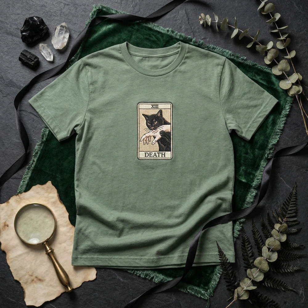 This design is a striking interpretation of the XIII Death tarot card, featuring a sleek black cat biting a human hand within a classic rectangular tarot border. The embroidery measures a substantial 20cm x 28cm and is centered on a high-quality Charcoal Grey garment. We use a sophisticated mix of dense tatami fills for the Vintage Cream (#E5D3B3) stippled background and Jet Black (#000000) cat body, accented by premium satin stitch for the Roman numeral ‘XIII’ and ‘DEATH’ lettering. The celestial stars and fine line embroidery create a textured, high-end feel that mimics vintage aged paper.