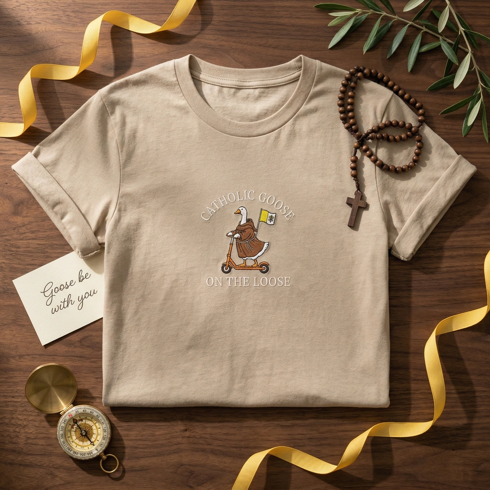 This design is a playful parody of the popular ‘Silly Goose on the Loose’ internet meme. We have adapted the concept to feature a goose dressed as a friar holding the Vatican City flag to create a fun, relatable piece of apparel for the modern Catholic community.
