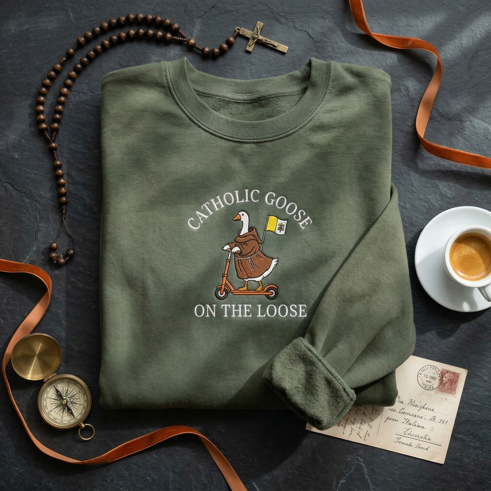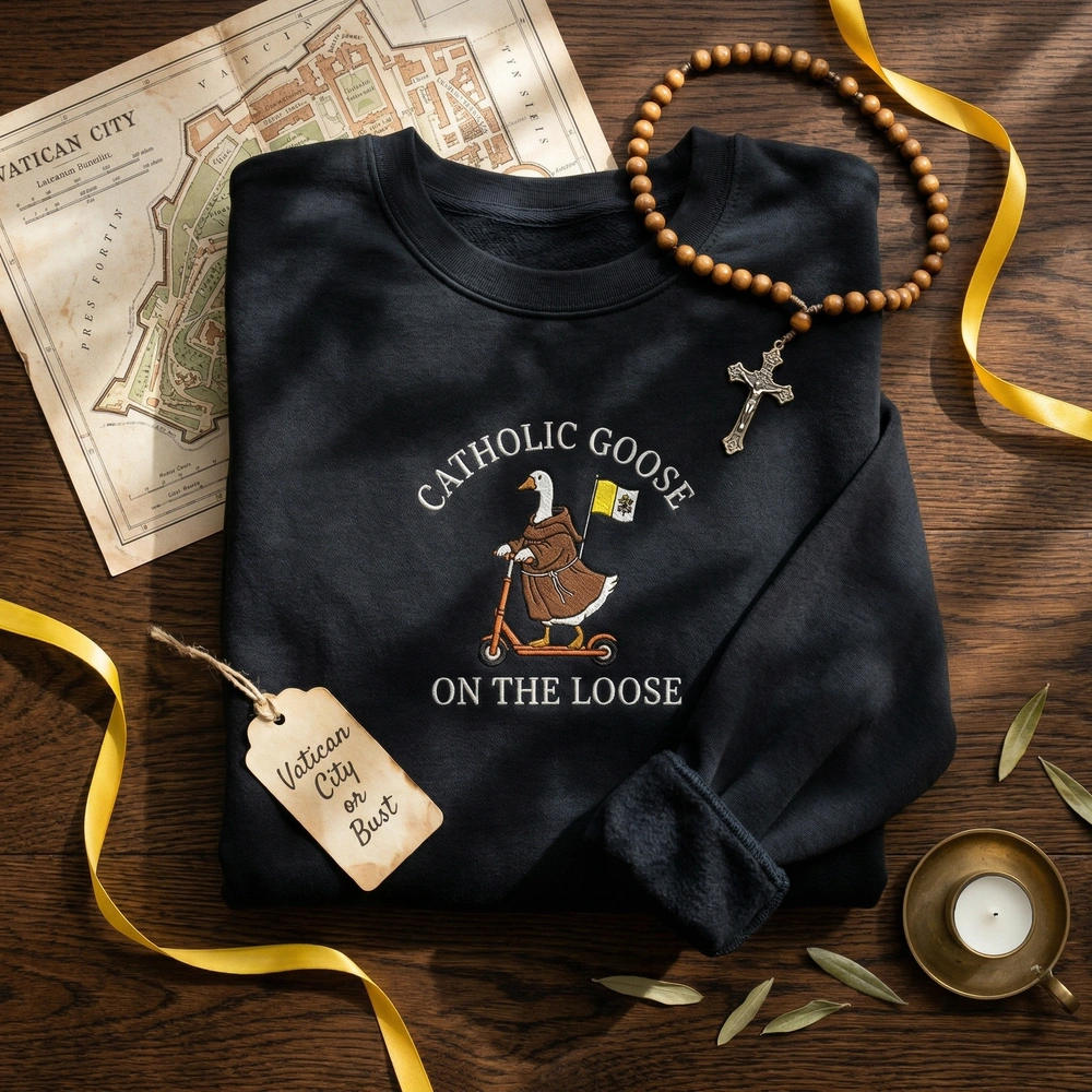 The Catholic Sweatshirt Embroidered Sweatshirt features a hilarious ‘Goose on the Loose’ in a friar robe, making it the ultimate funny catholic gift for fans.