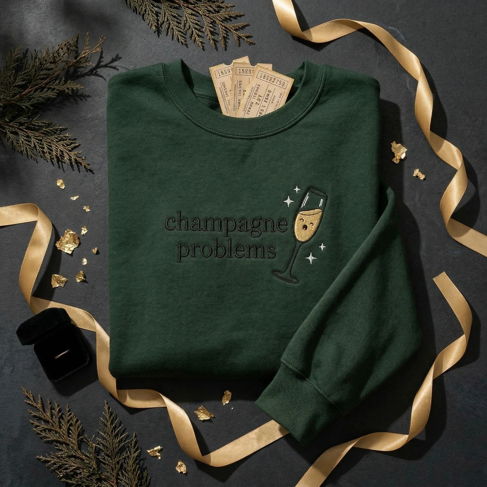The Champagne Problems Embroidered Sweatshirt is a premium machine-embroidered top featuring a minimalist flute design—perfect for music lyric fans.