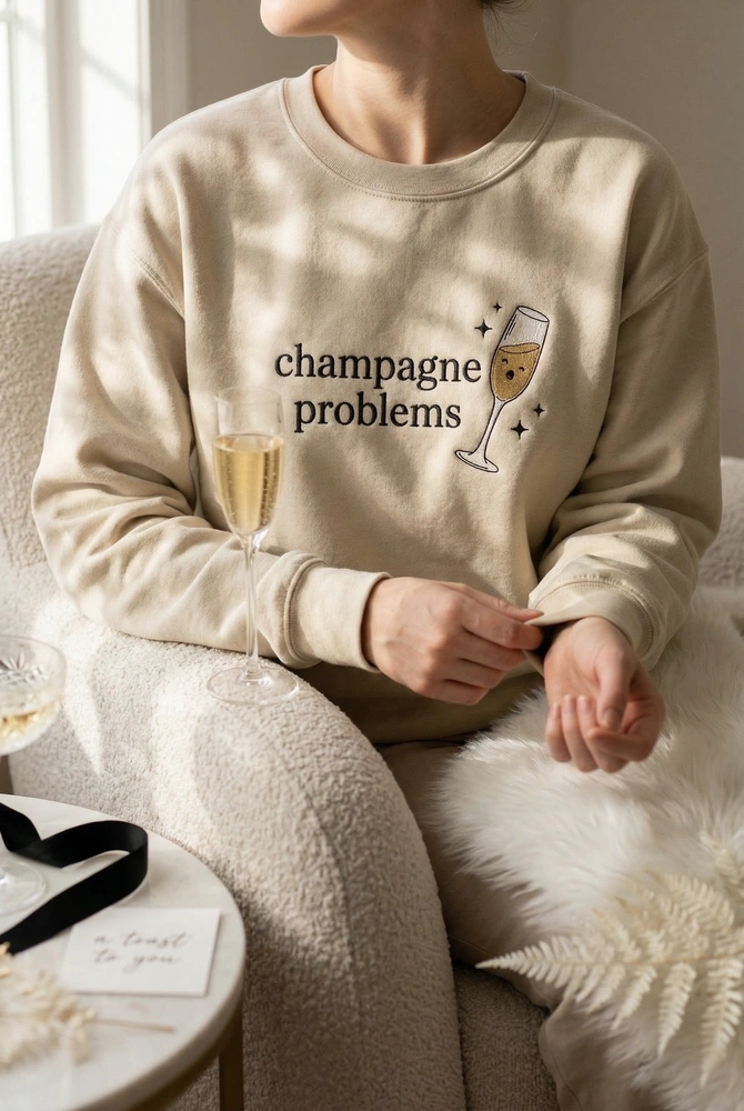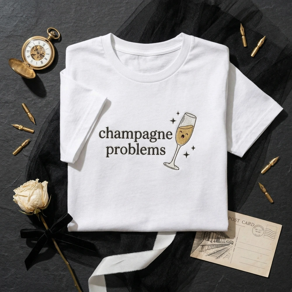This exclusive design features a delicate champagne flute on the left chest, rendered in fine black linework with a shimmering champagne gold fill to represent the bubbly liquid. Tiny white highlights and floating sparkle details add a touch of elegance to the embroidery. To the right of the glass, the phrase “champagne problems” is stitched in a classic, slightly distressed typewriter-style serif font using premium black thread. The embroidery measures approximately 10cm x 6cm and uses a 3-color palette (Black, Champagne Gold, and Bright White) that pops beautifully against the soft Cream garment color.