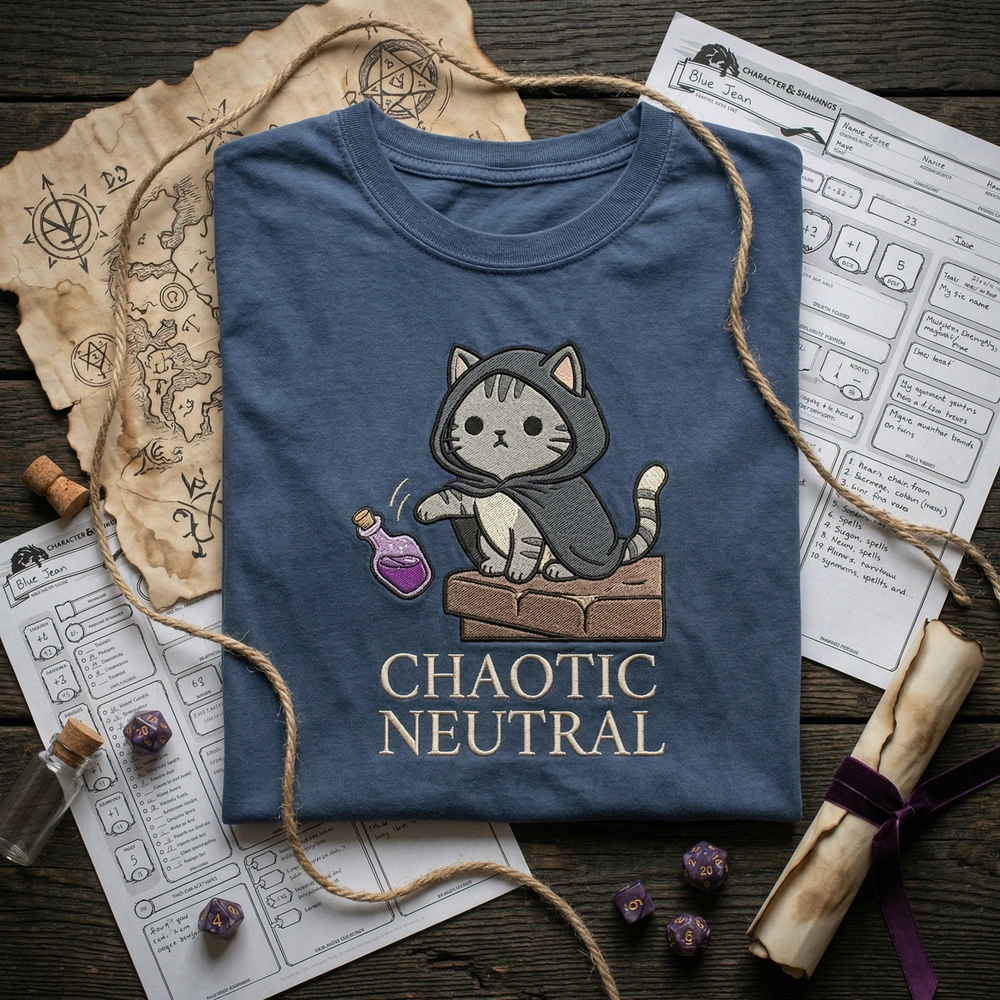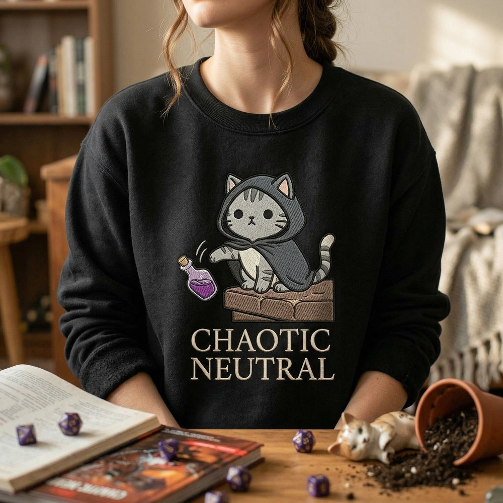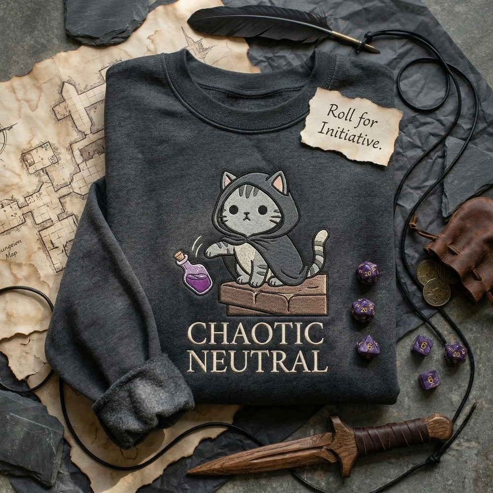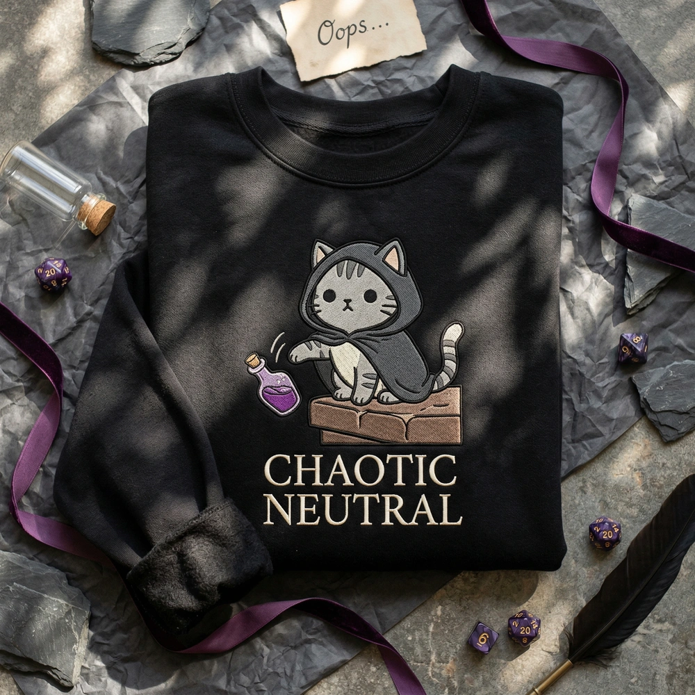 Celebrate the absolute lack of remorse only a feline can display with this high-quality dnd cat alignment piece. Whether you are a dedicated dungeon master or a cat owner who has watched their favorite mug meet its doom, this sweatshirt captures that specific energy perfectly. It is the ideal conversation starter for your next gaming session or casual outing. Browse more embroidered sweatshirts in our collection to find your perfect match.