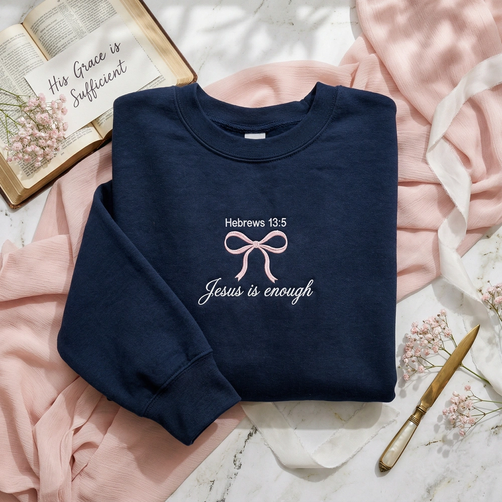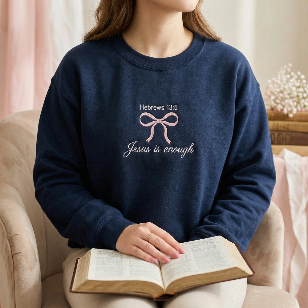 This original design is expertly rendered on a deep navy garment, providing a sophisticated backdrop for the soft color palette. At the top of the chest, “Hebrews 13:5” is embroidered in a crisp white minimalist font. Below the scripture sits a large, continuous-line coquette bow in soft pink thread, executed with a fine running stitch to maintain an airy, wispy appearance. The focal point is the “Jesus is enough” script, which uses a premium thin satin stitch to create a slightly raised, high-end texture. The entire composition measures approximately 18cm x 12cm, ensuring a balanced and trendy look.