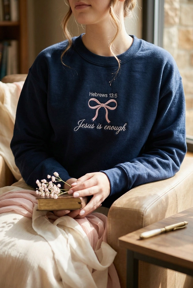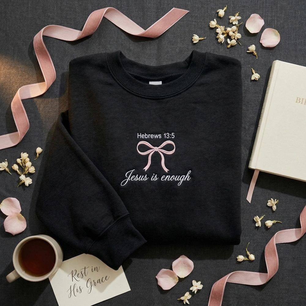 This piece is designed for the modern woman who wants to integrate her faith with the viral coquette aesthetic. Combining the “clean girl” trend with a deep spiritual message, this sweatshirt serves as a beautiful reminder of sufficiency in Christ. Whether you are searching for a minimalist faith apparel piece for yourself or a meaningful gift, these christian sweatshirts provide high-fashion style with a purpose. Browse our entire collection of embroidered sweatshirts to discover more faith-based designs.