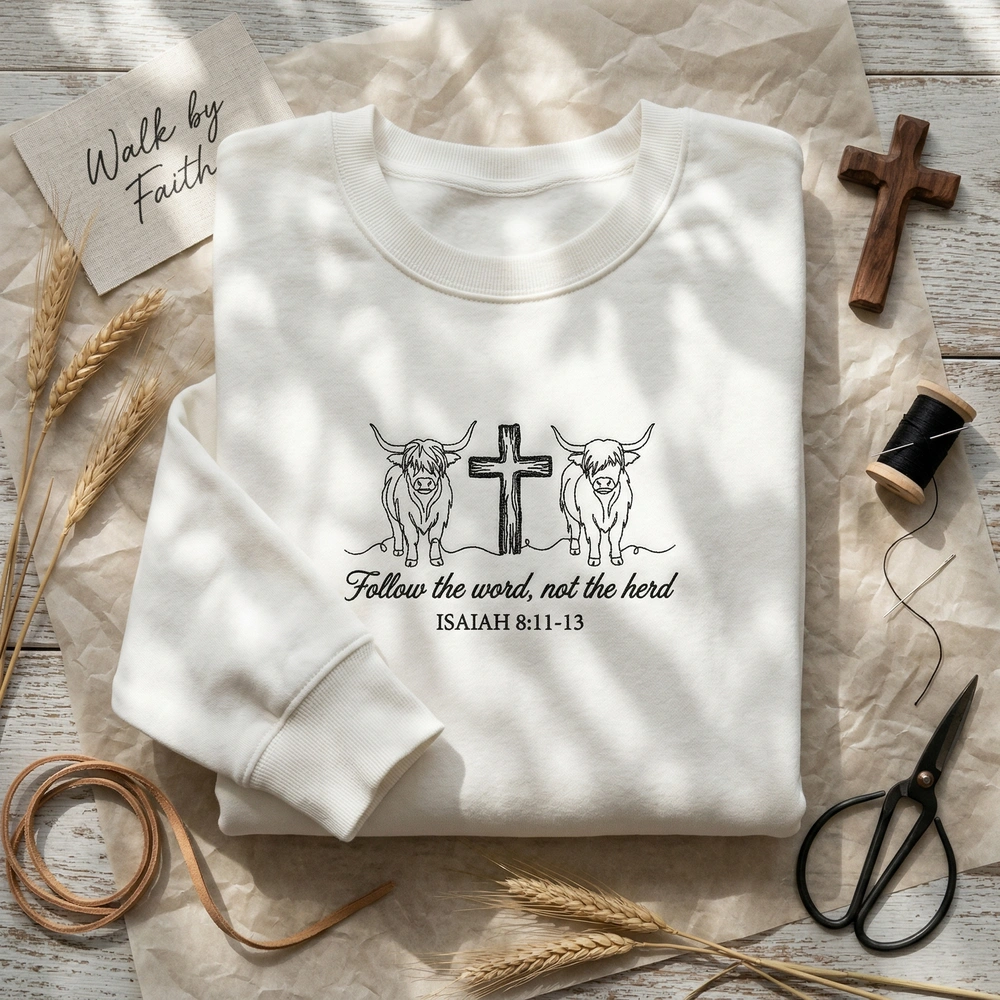 This design is expertly rendered in a deep black thread (#000000) on a premium white garment, creating a high-contrast, clean look. The embroidery measures 25cm x 18cm and is positioned center-chest for maximum impact. We utilize a precise running stitch for the delicate continuous line art of the shaggy Highland cows and rustic cross to maintain a hand-drawn feel, while the “Follow the word, not the herd” script and “ISAIAH 8:11-13” citation are finished in a fine satin stitch for exceptional durability and legibility.