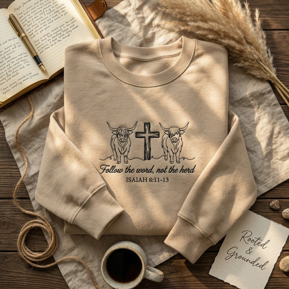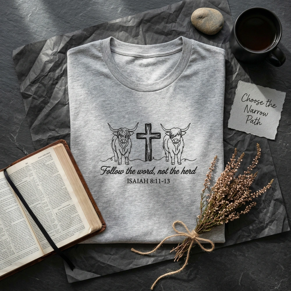 This design references the biblical call to walk differently than the world. It serves as a reminder to fear God and follow His instructions rather than conforming to popular trends or “the herd” mentality, symbolized by the peaceful Highland cows flanking the cross.