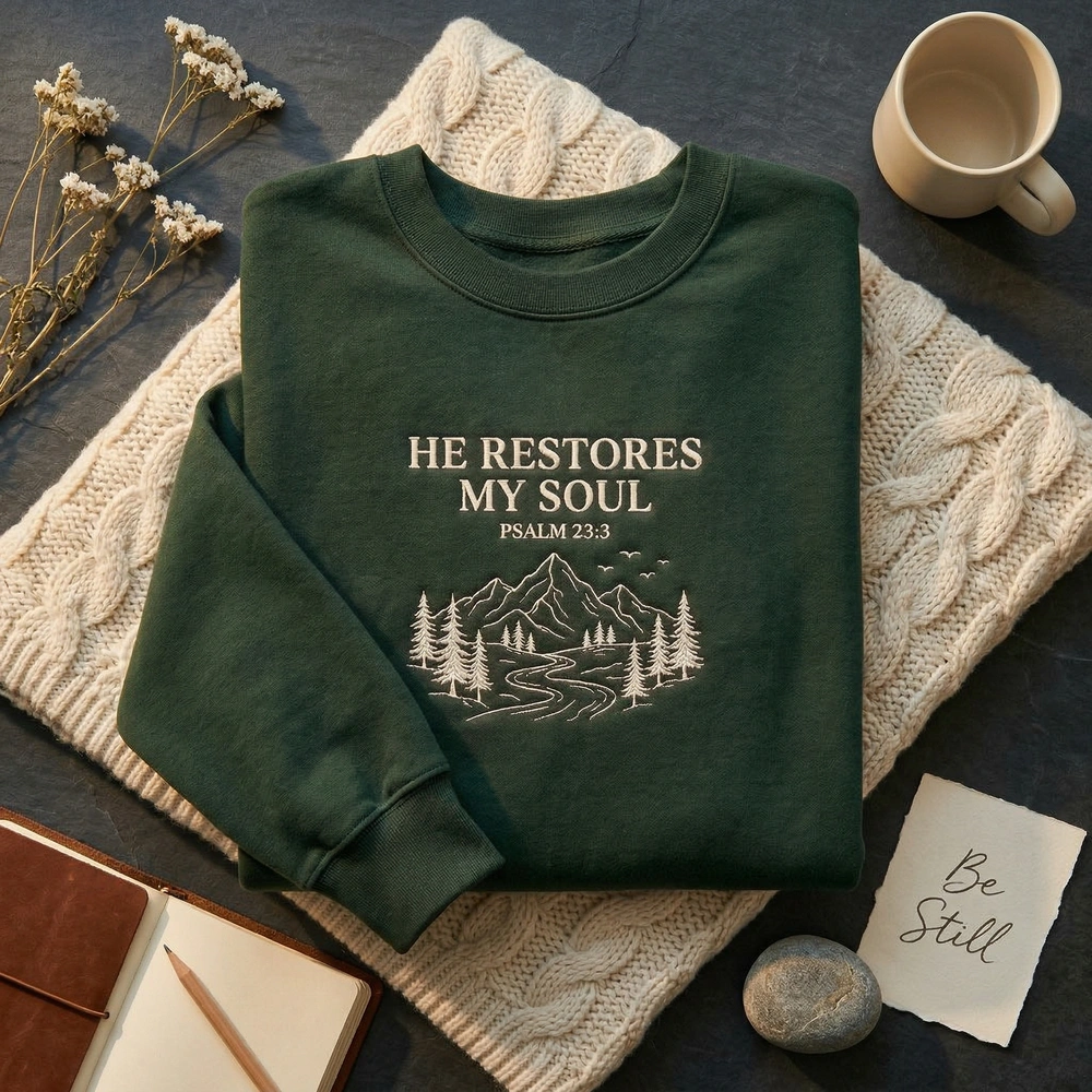 This Christian sweatshirt is a premium machine-embroidered garment featuring a serene Psalm 23:3 design, blending spiritual peace with a nature-inspired aesthetic.