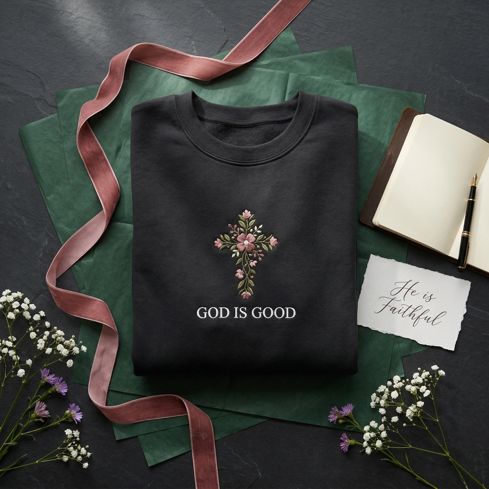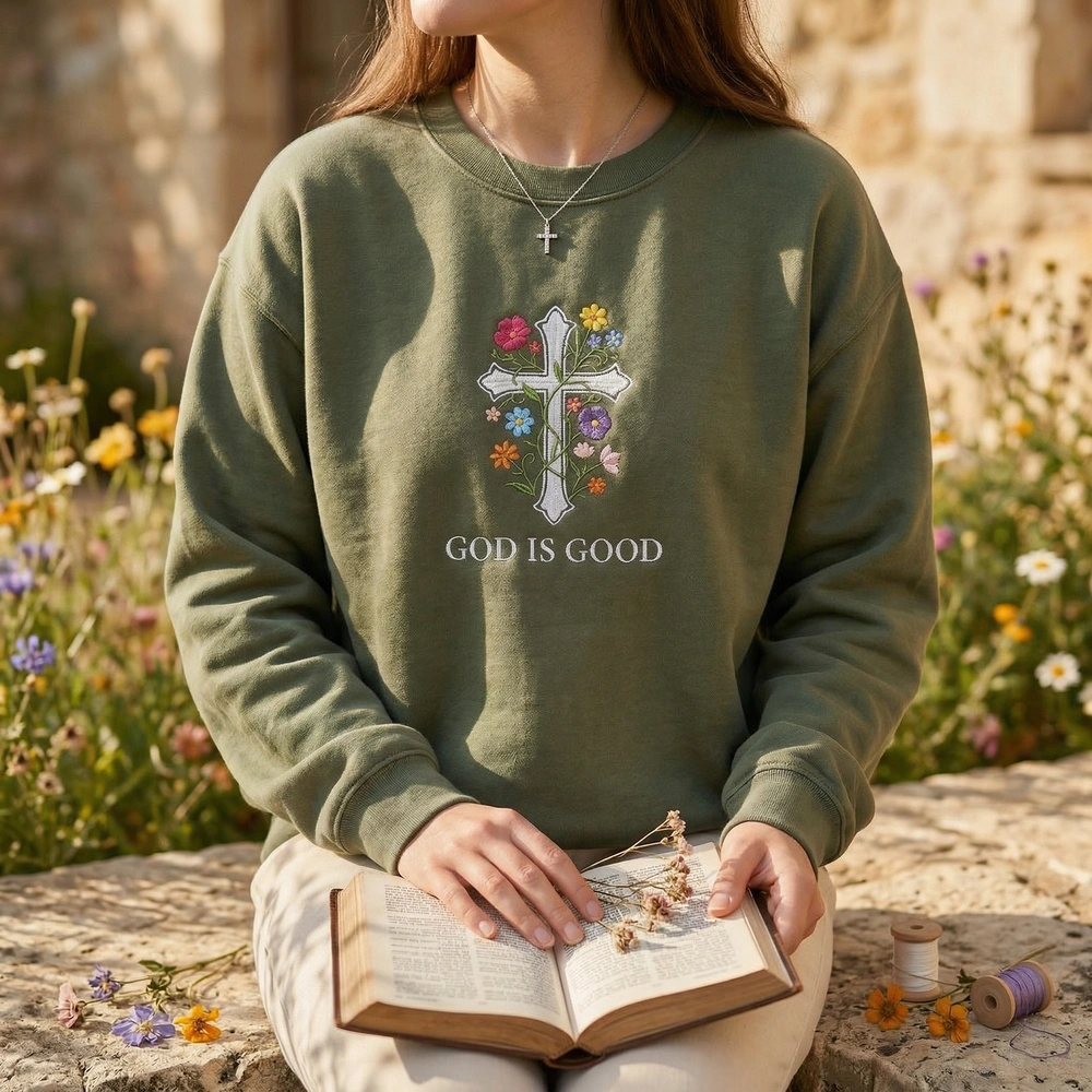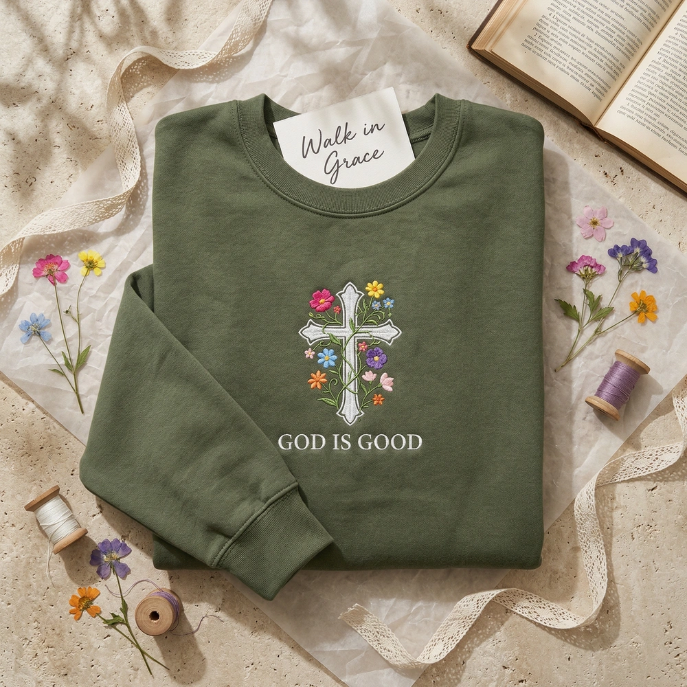 This original artwork is meticulously rendered on a high-quality Military Green garment, providing a rich, earthy canvas for the vibrant embroidery. The central focus is a 20cm x 28cm white satin stitch cross, which offers a crisp and clean finish. Intertwining with the cross is a delicate green vine featuring wildflowers in Arctic White, Pink Rose, Sunflower Yellow, Sky Blue, Deep Purple, and Vibrant Orange. We utilize over 8 thread colors and dense, textured fill stitches to give the floral elements a slight 3D tactile quality. The phrase ‘GOD IS GOOD.’ is embroidered below the design in a minimalist white sans-serif font for a modern, clean aesthetic.