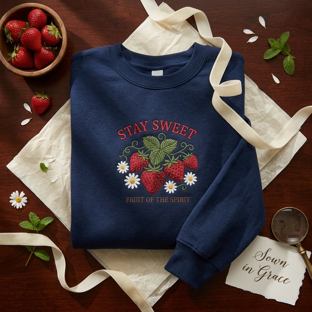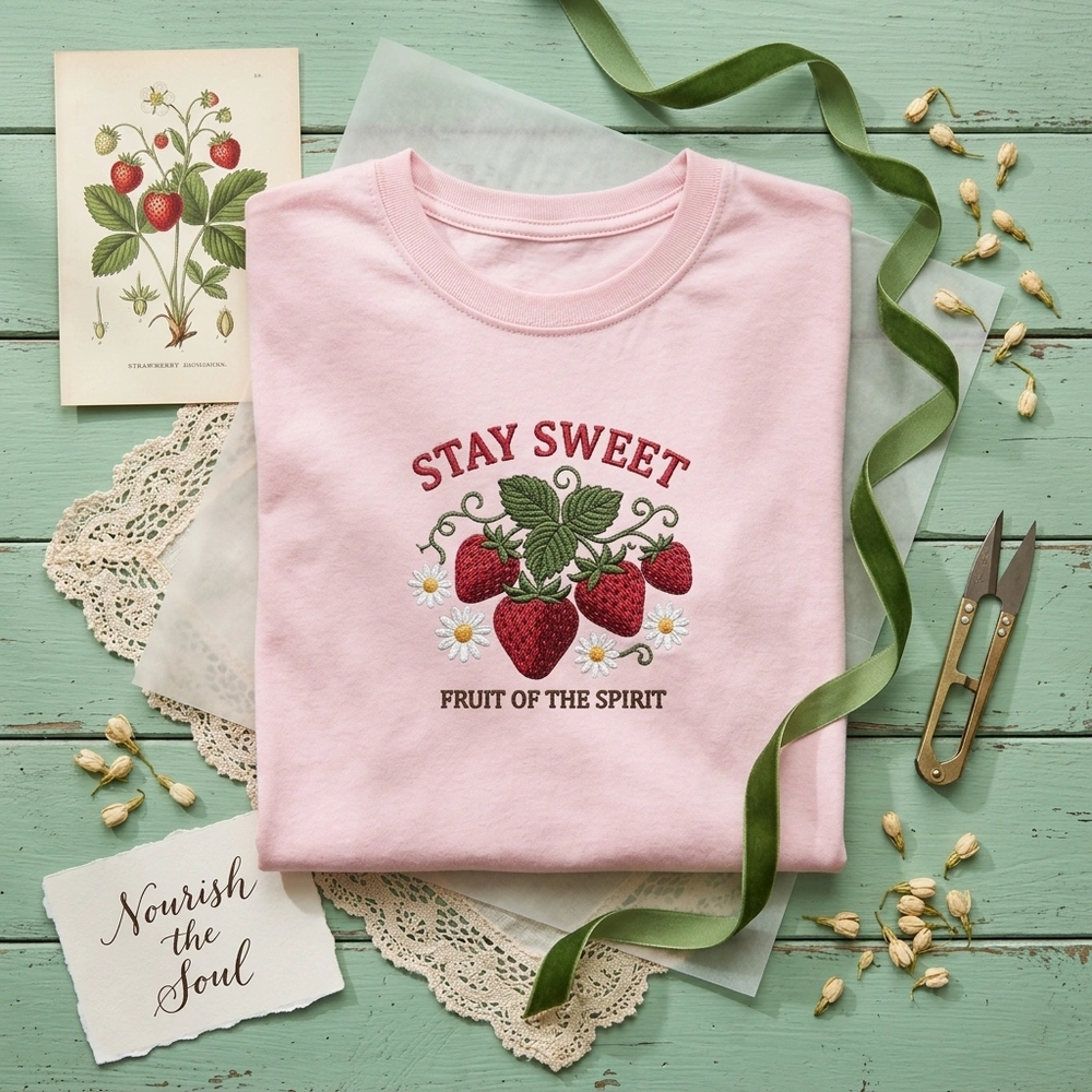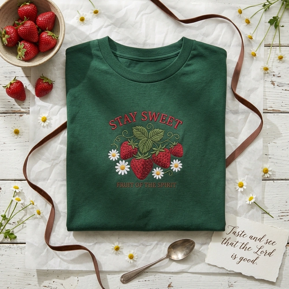 This intricate 15cm x 15cm embroidery is featured on a high-quality Sport Grey garment. The design showcases four ripe strawberries rendered in a dense crimson red tatami fill stitch, paired with delicate white daisies featuring golden yellow centers. Above the fruit, the phrase ‘STAY SWEET’ is stitched in a raised red satin font, while ‘FRUIT OF THE SPIRIT’ is anchored below in a grounded dark brown serif font. We use five distinct thread colors (Crimson Red, Forest Green, Pure White, Golden Yellow, and Dark Brown) to create a premium, tactile feel that stands out from standard printed shirts.