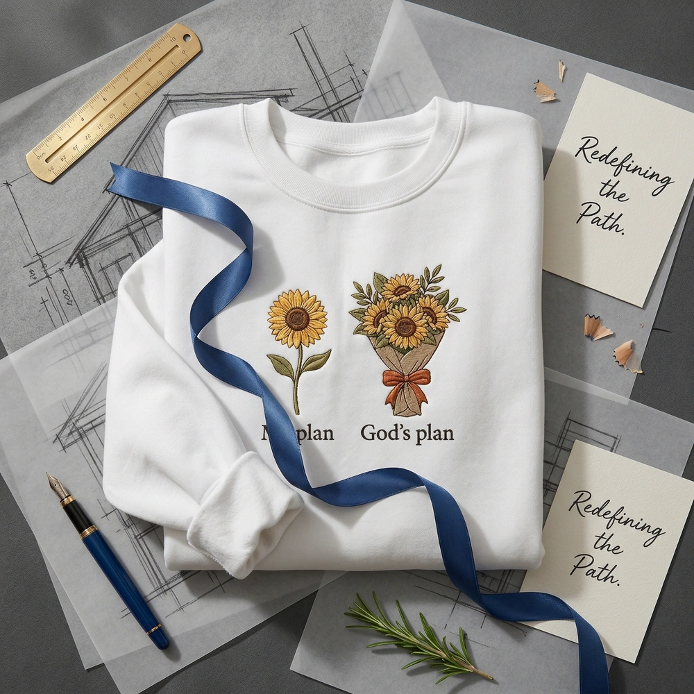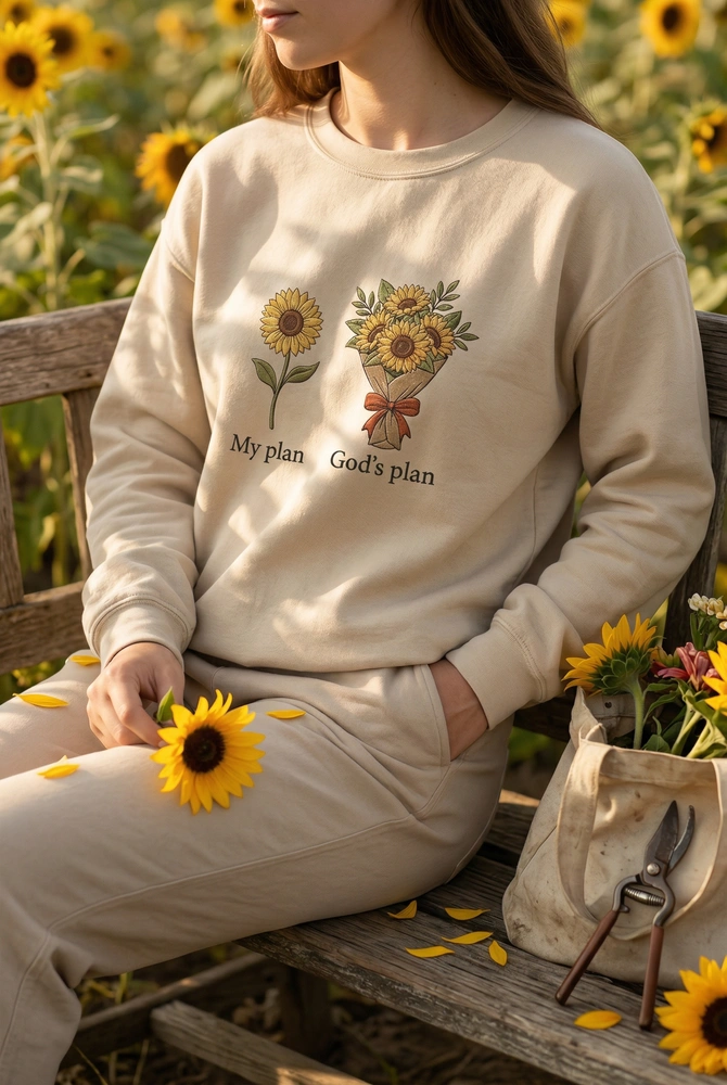 The Christian Sweatshirt Embroidered Sweatshirt features a meaningful God’s Plan sunflower design, contrasting human vision with divine abundance on a Sand garment.